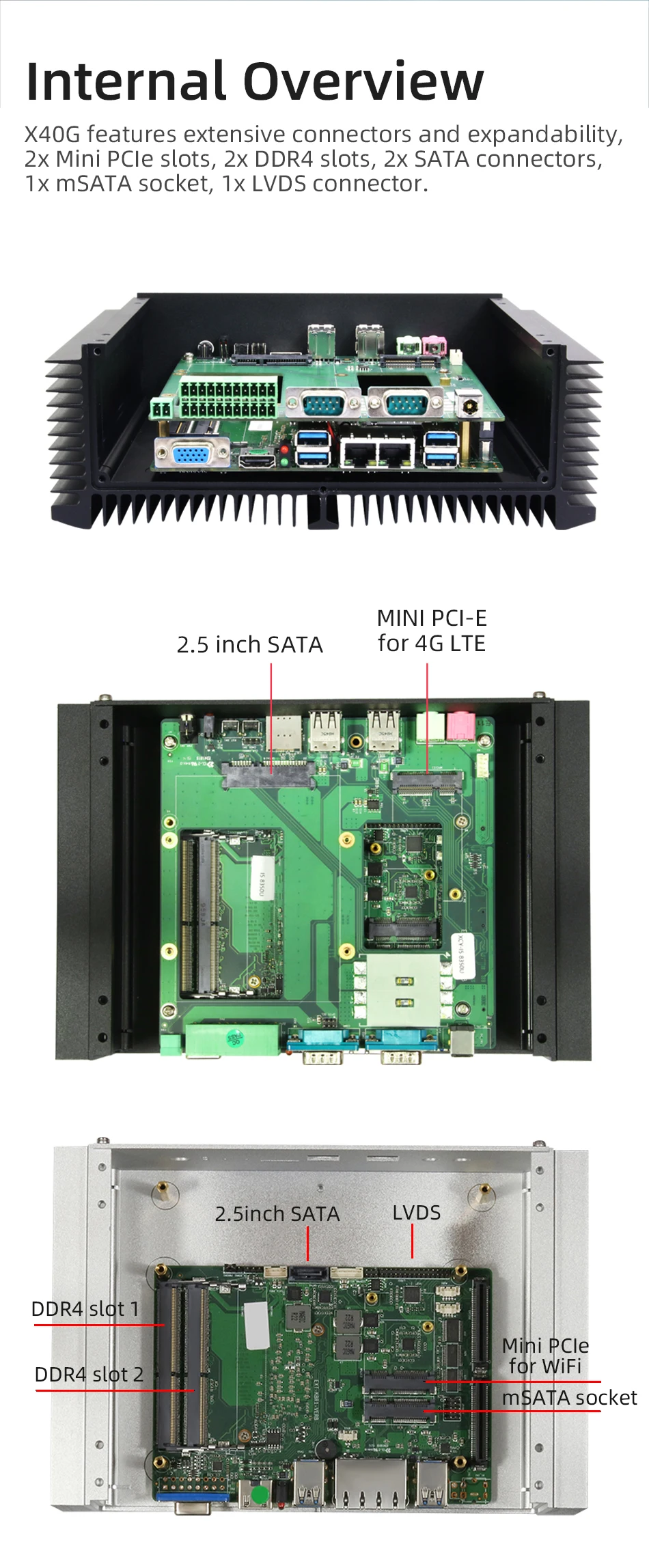 2× Mini PCIE,1 half height size,support WiFi/BT,1 full height size,support 3G/4G module