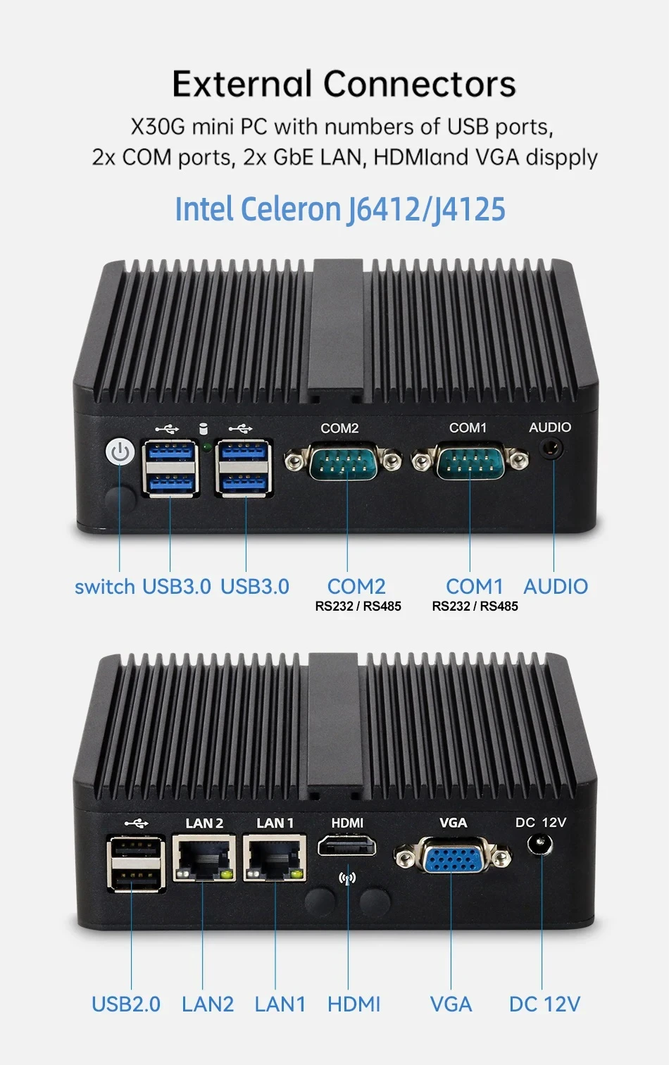 Mini ventilador industrial para PC Intel Celeron J6412 8GB DDR4 512GB M.2 NVMe SSD 2x COM RS485/232 2x GbE LAN 6x USB Windows 10/11 Linux