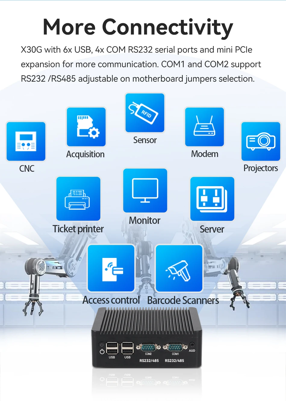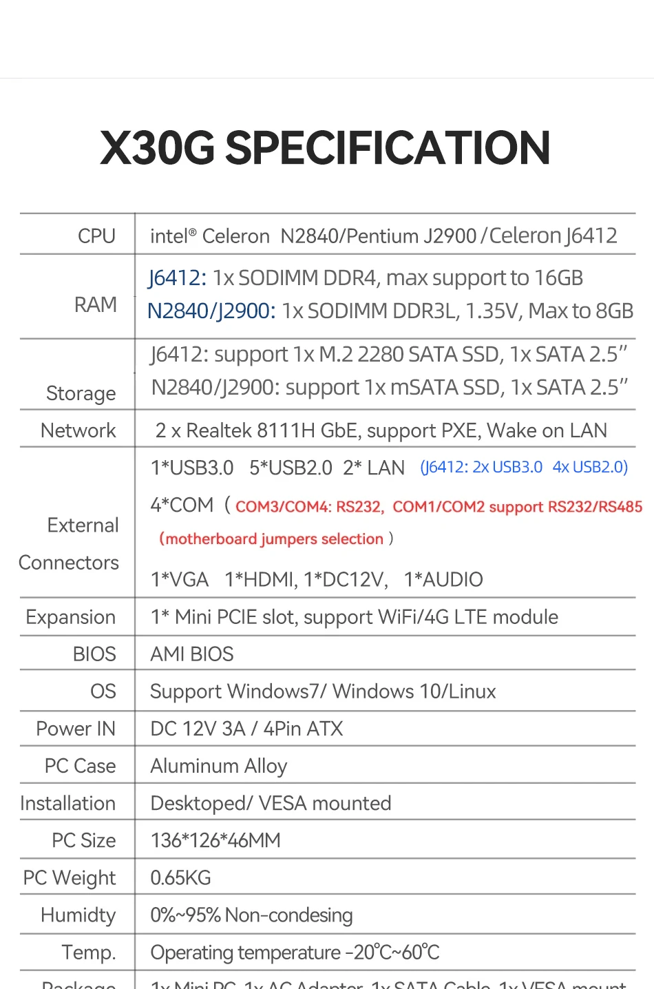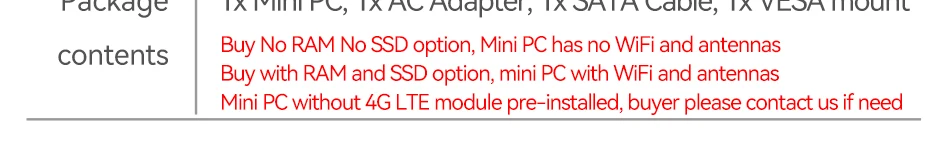 1x ranura mini PCIE para WIFI, módulo 4G LTE, 1x ranura SIM a bordo