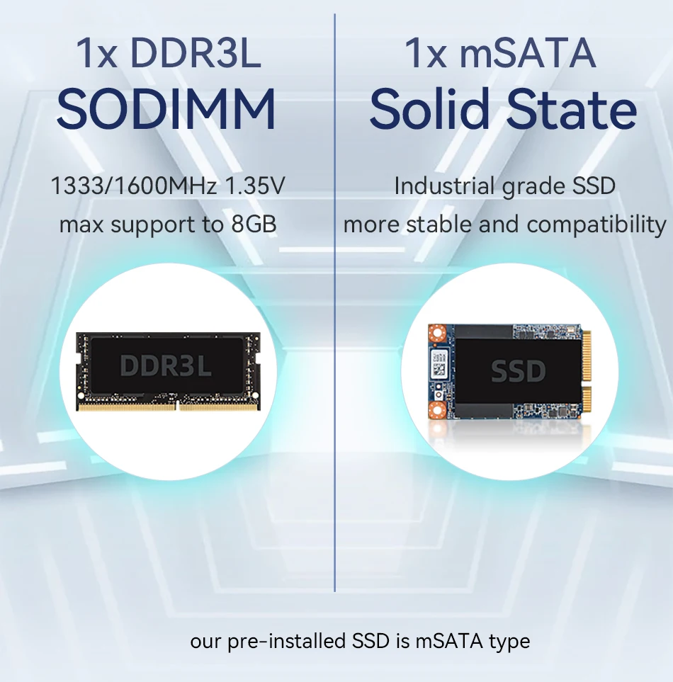 N2840/J2900: 1x DDR3L SO-DIMM 1,35 V 1333/1600 MHz, soporte máximo de 8 GB