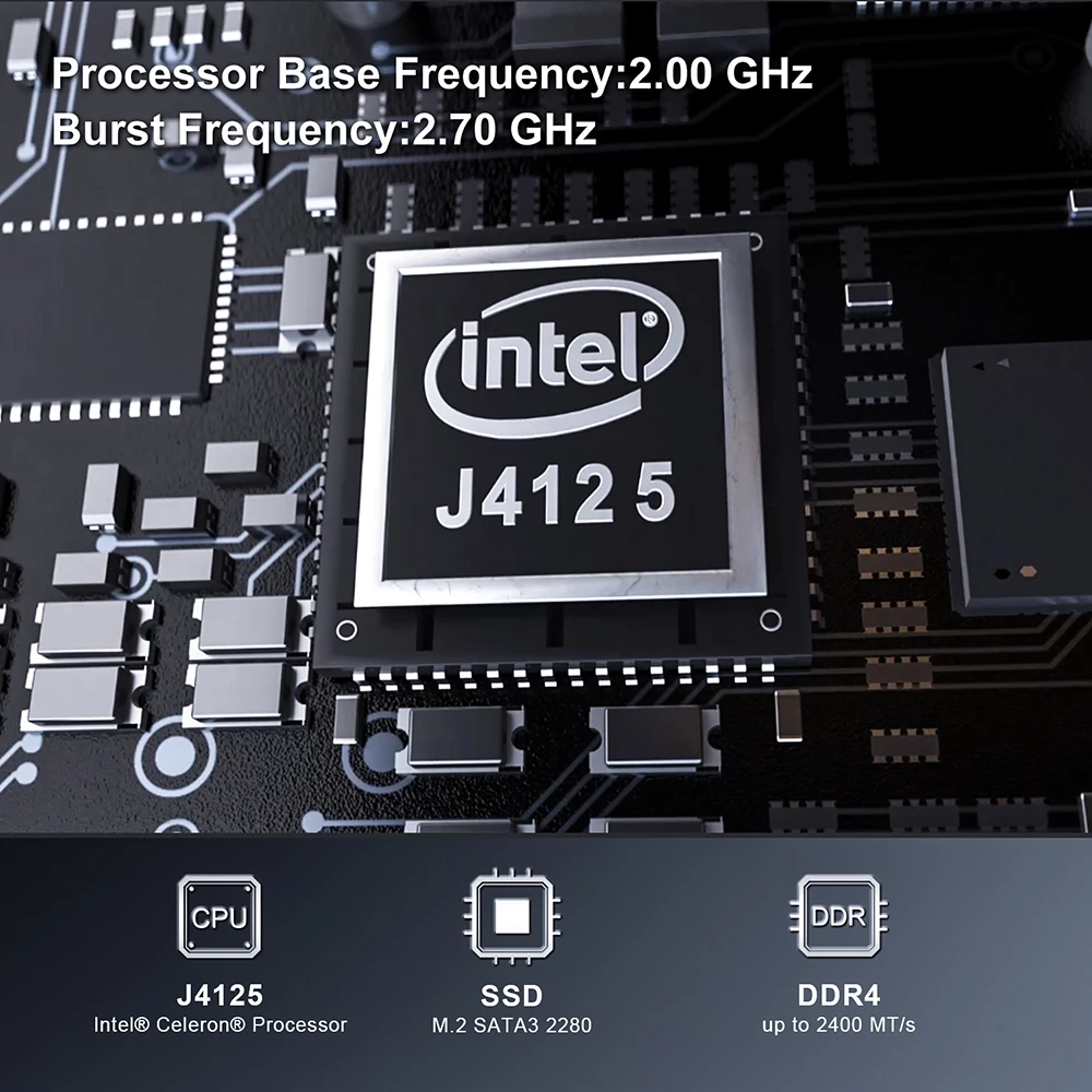 CPU: Intel® Gemini Lake Refresh Processor J4125 (4C/4C, 4M Cache, 2,0 GHz hasta 2,7 GHz).