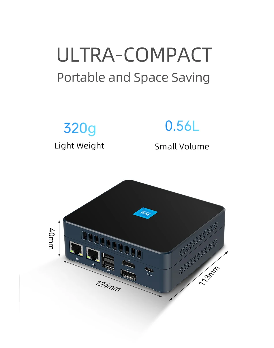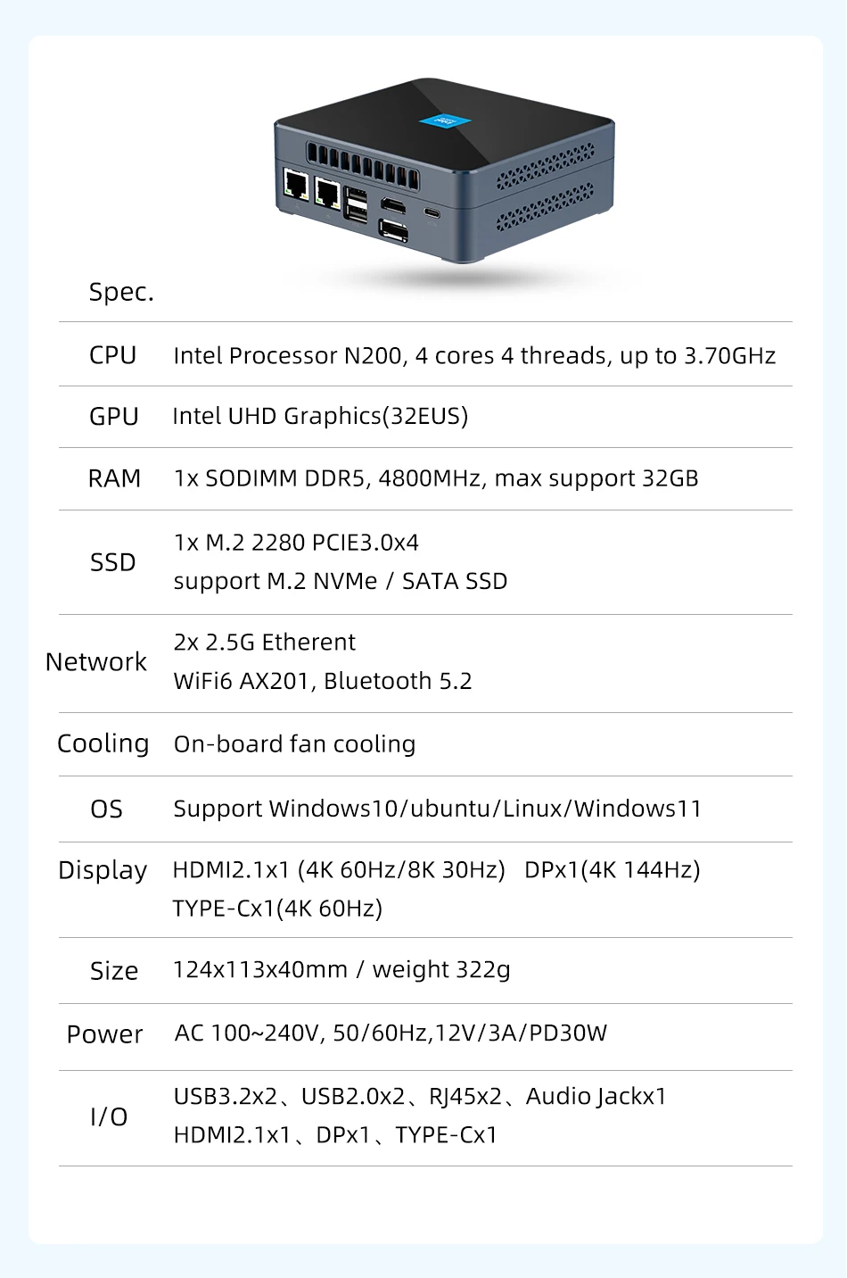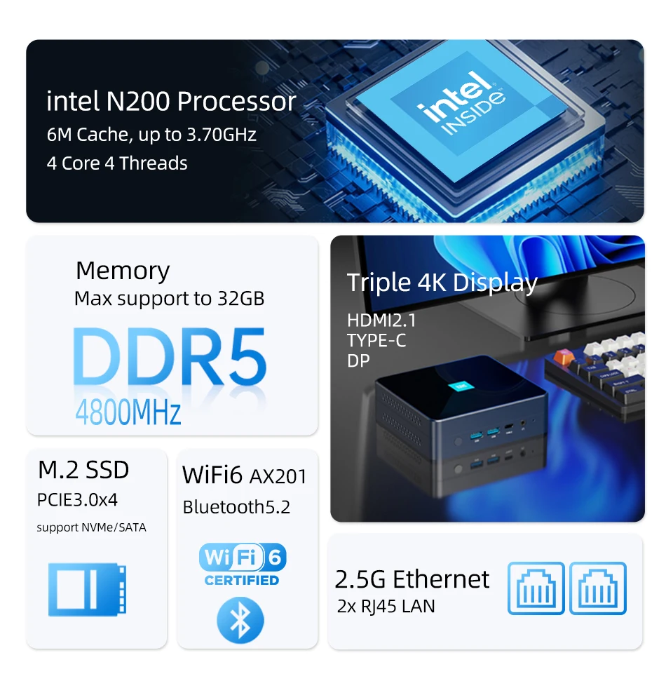 Mini PC de oficina en casa procesador Intel N200 DDR5 M.2 NVMe SSD WiFi6 Windows11 2x Ethernet USB3.2 tipo C HDMI2.1 DP 4K pantalla