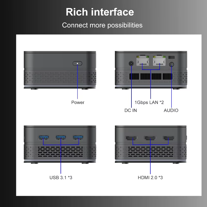 ● CPU: Intel Alder Lake N100, 4 núcleos, 4 hilos, 0,8 GHz hasta 3,4 GHz, caché de 6MB● GPU: GPU de gráficos Intel® UHD, hasta 750MHz; 24 unidades de ejecución● RAM: 8GB/16GB LPDDR5 4800MHzSSD: 256GB/512GB SATA SSD o 512GB/1TB NVMe SSD (M.2 2242)● Salida: HDMI 2,0x3; Admite salida de tres pantallas (clon o extensión)● LAN: 1Gbps Ethernet x2; Admite ruta suave y puerta de enlace doméstica● Inalámbrico: doble banda WiFi5, Bluetooth 4,2● USB: USB 3,1*3● El ordenador de bolsillo Alder Lake N100 más pequeño del mundo● Luces RGB más frías para correr