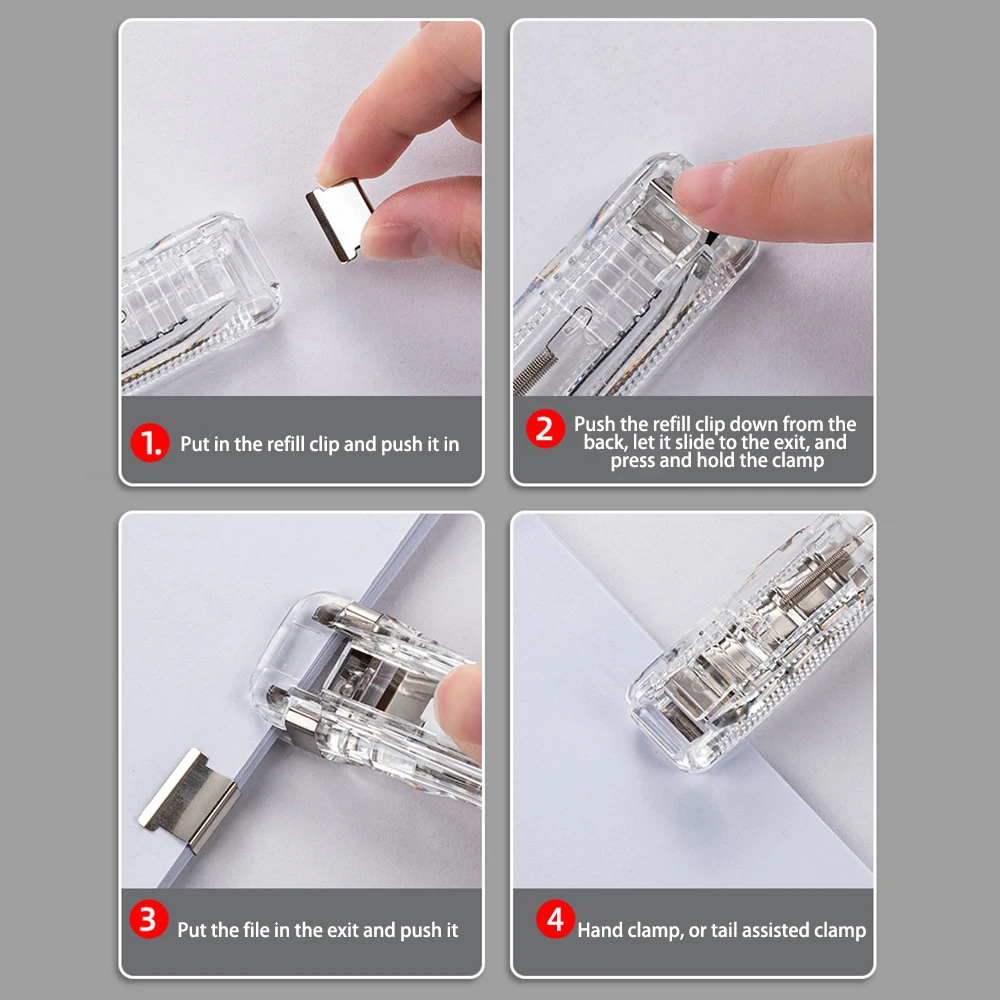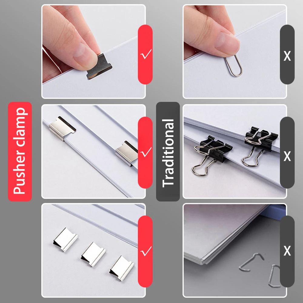 1. [Grapado no destructivo] A diferencia de las grapadoras tradicionales, el uso de una abrazadera de empuje para asegurar el papel no causa daños al papel. Es compacto en tamaño, firme en la sujeción del papel y fácil de grapar.