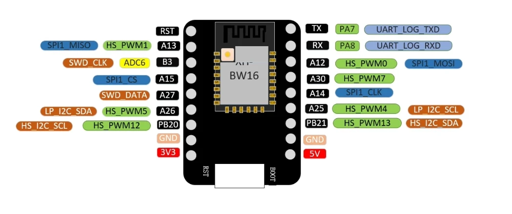 The MINI BW16 development board is a core development board designed for the BW16 module. This development board continues the classic design of the NodeMCU development board, leading out the commonly used 1/O to the pin headers on both sides. The board is equipped with the RTL8720 module, and developers can also connect peripherals according to their own needs. BW16 is a dual-band Wi-Fi+ Bluetooth SoC module developed based on the RTL8720DN chip. It supports dual-band (2.4GHz or 5GHz)WLAN and low-power Bluetooth 5.0; And it integrates ARM V8(compatible with Cortex-M4F) high-performance MCU, ARM V8M(compatible with Cortex-MO) low-power MCU, WLAN(802.11a/b/g/n), MAC, Bluetooth baseband and RF baseband, and also provides a set of configurable GPIO ports. Used for the control of different peripheral devices.