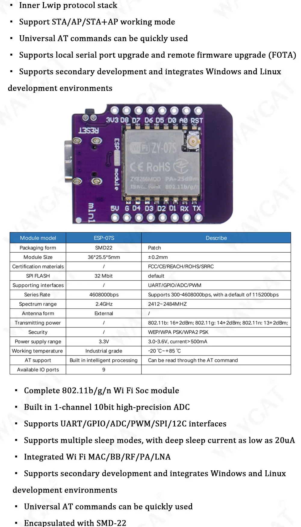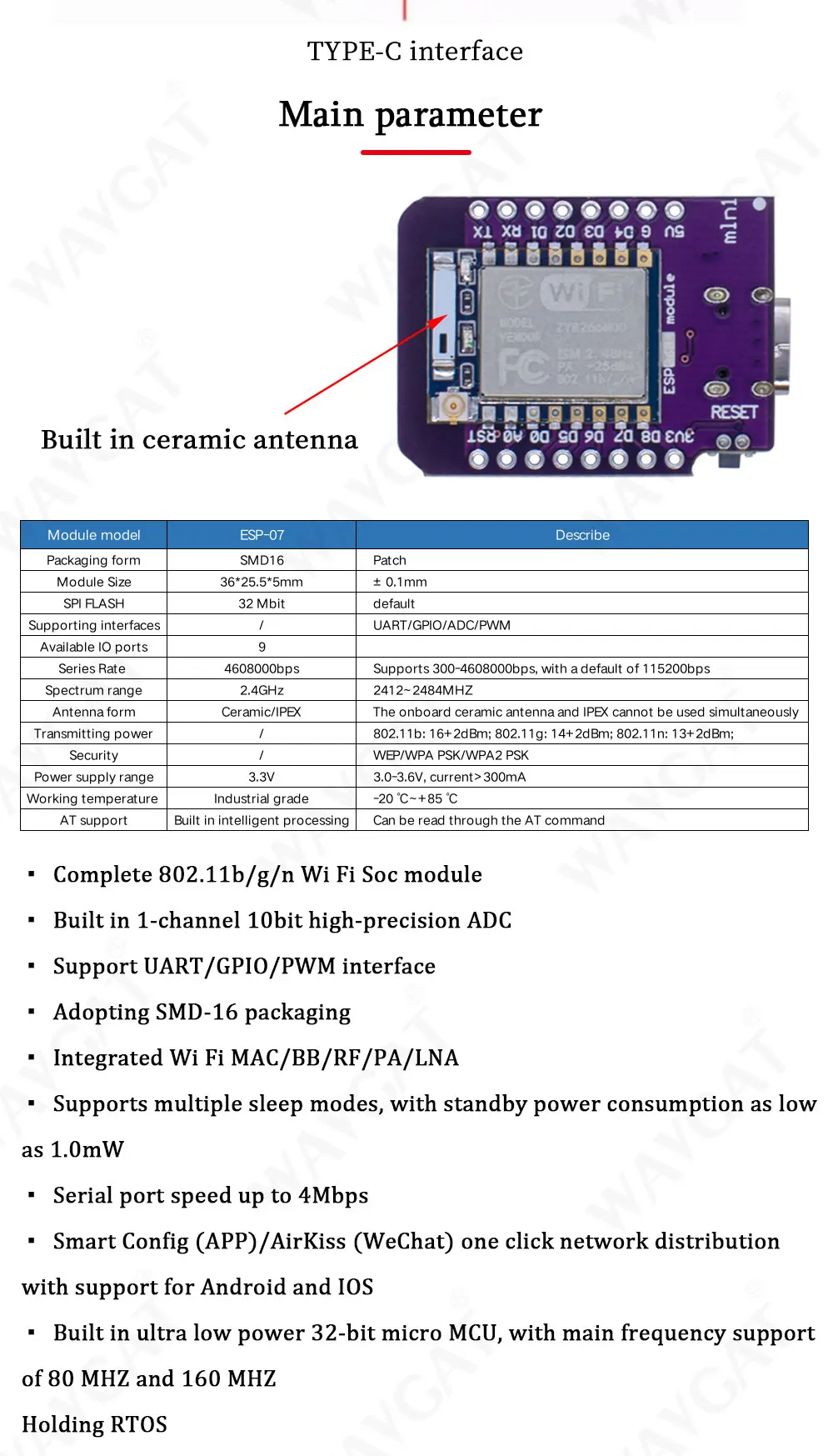 Mini Placa de desarrollo WIFI D1 Mini TYPE-C ESP8266 ESP-07/07S CH340G USB D1, NodeMCU Lua IOT, 3,3 V con pines