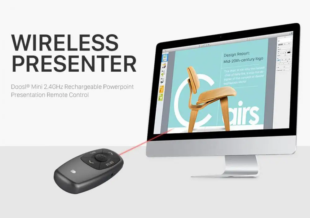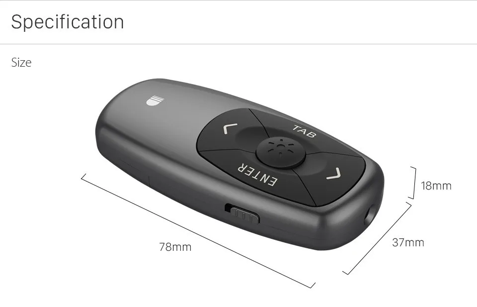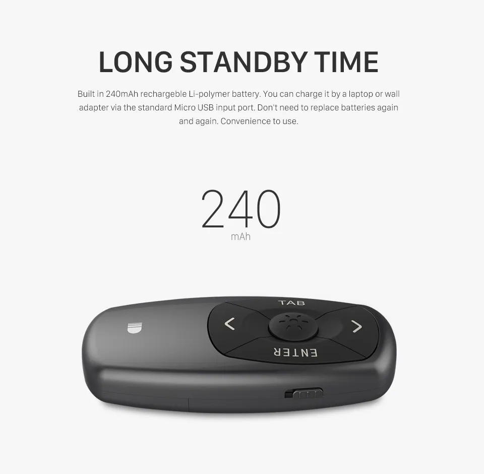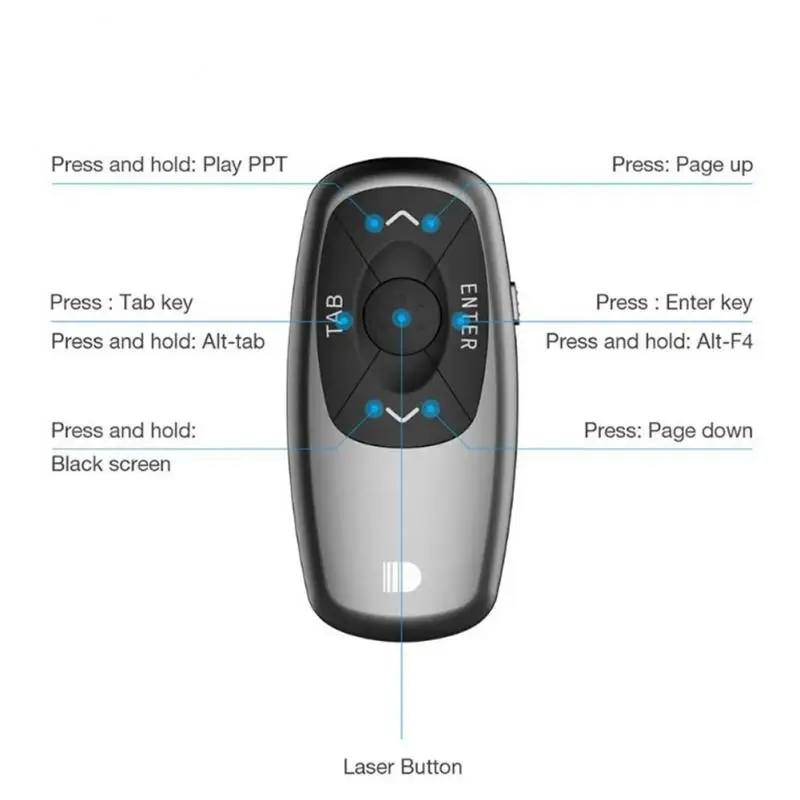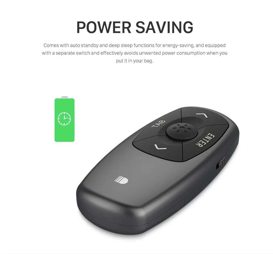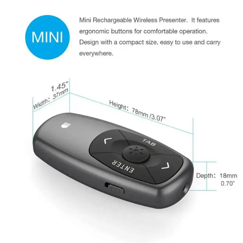 Mini presentador inalámbrico recargable. Botones ergonómicos para un funcionamiento cómodo.