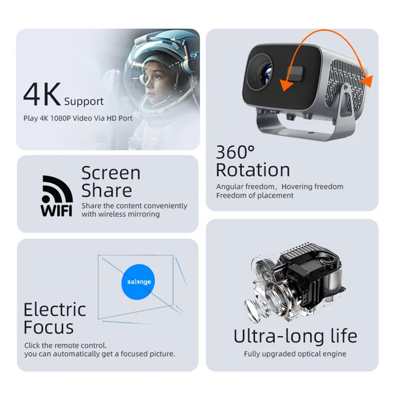 ● Rotación de 360: proyecte imágenes en techos, paredes e incluso paredes irregulares simplemente girando el proyector.