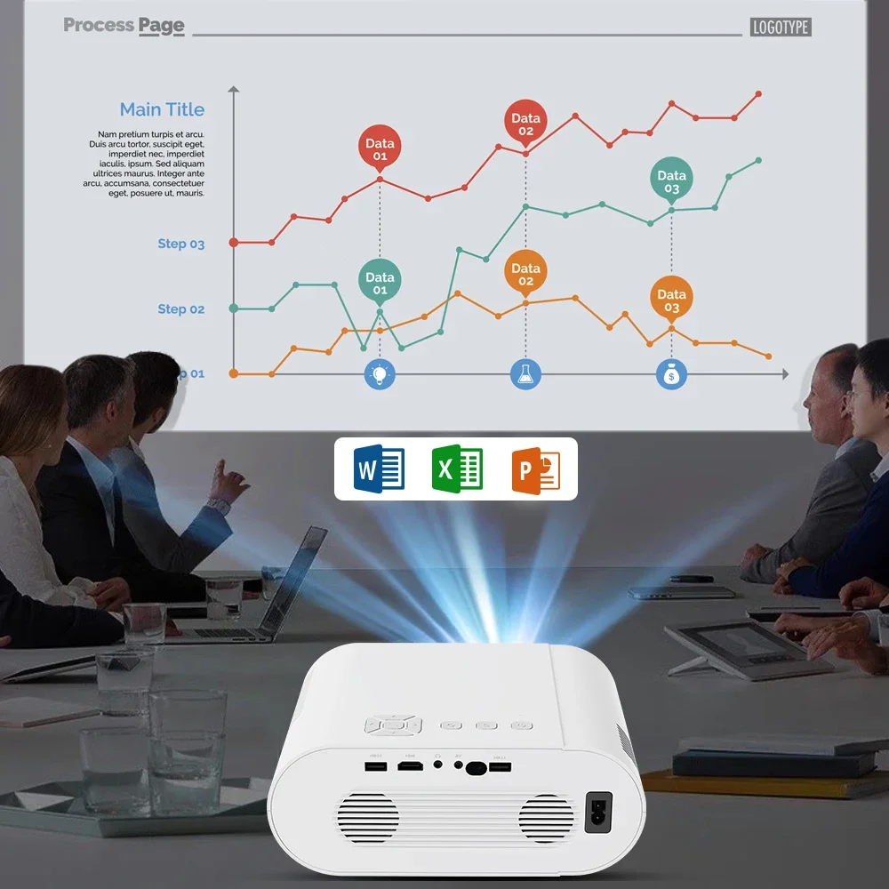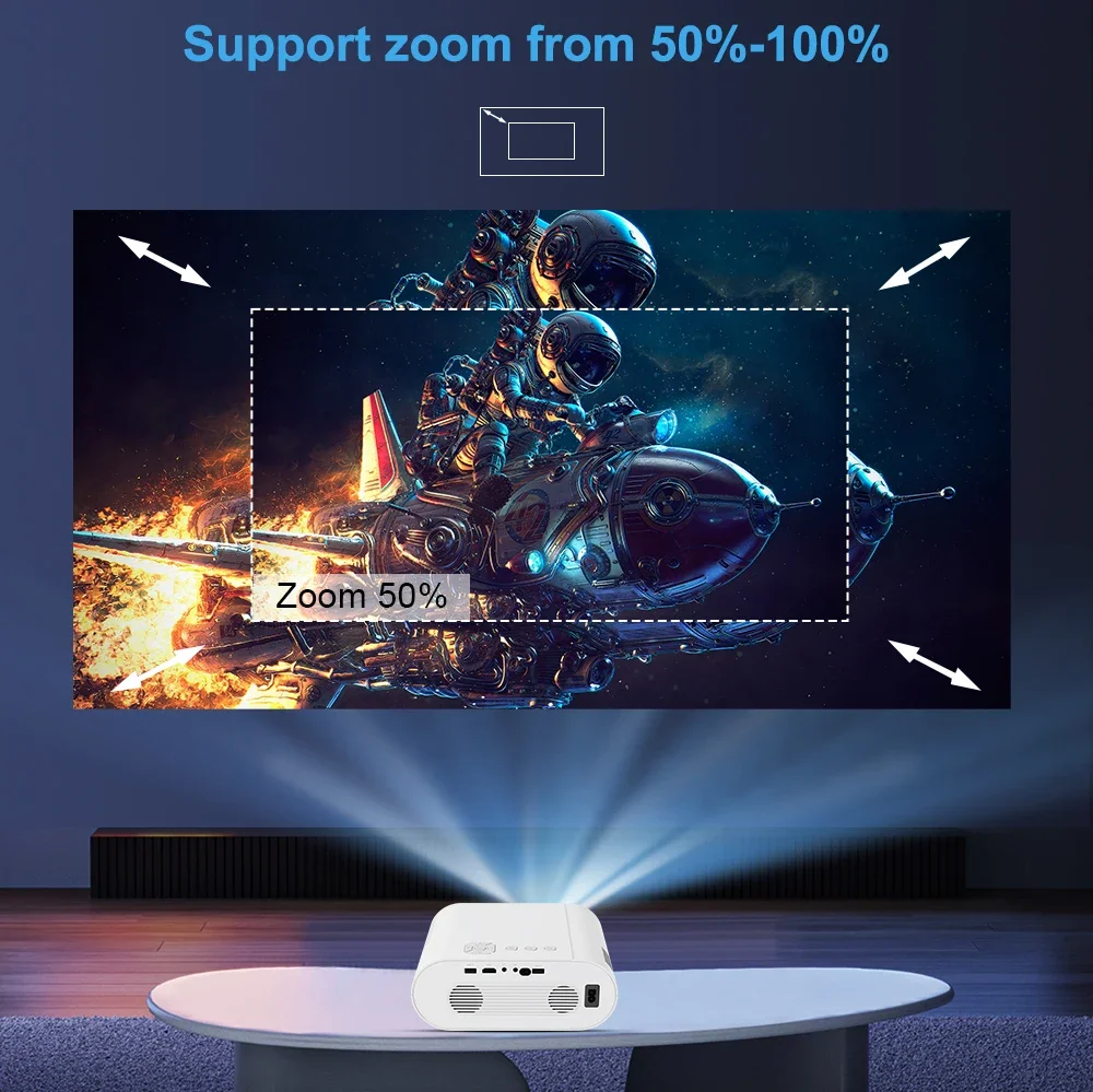 portable mini projector can play Excel/Word/PPT/PDF files directly from a USB stick and view them on the hd projector, rather than fussy cable connections with a laptop/PC, making the presentation more convenient. With the digital zoom function, the image size can be easily reduced from 100% to 50% without moving the home theater projector. The adjustable 50"150" screen also gives you the freedom to customize your screen size to fit any space.