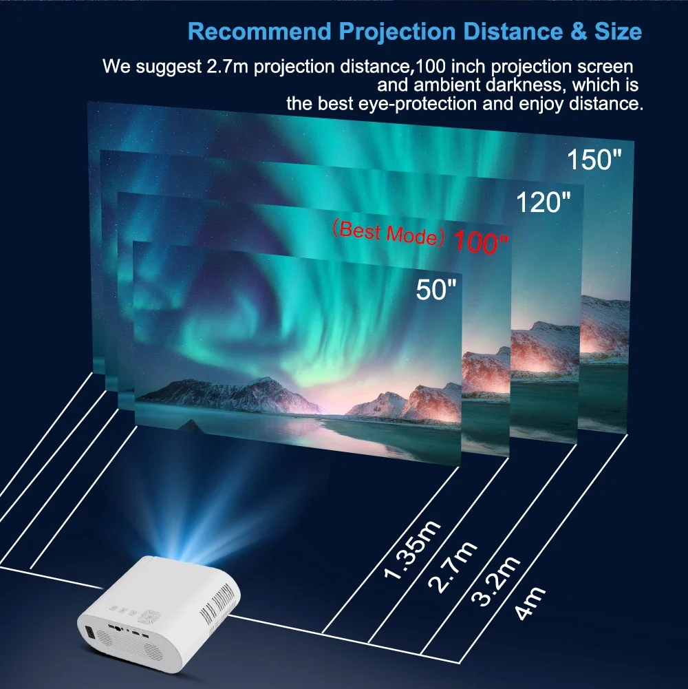 Outdoor video projector provides a 50-150inches projection display, 1.35-4 meters projection distance. Keystone correction and scaling make setting up and getting the perfect screen position a breeze.