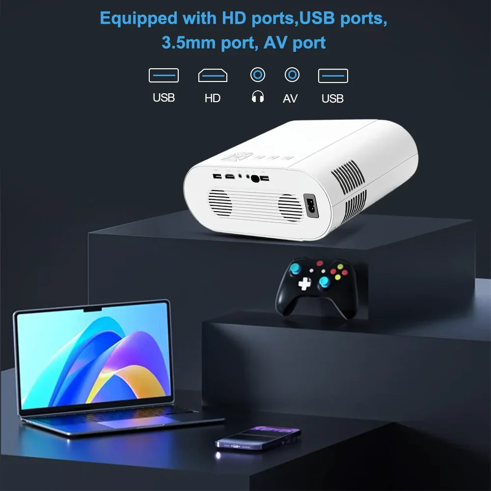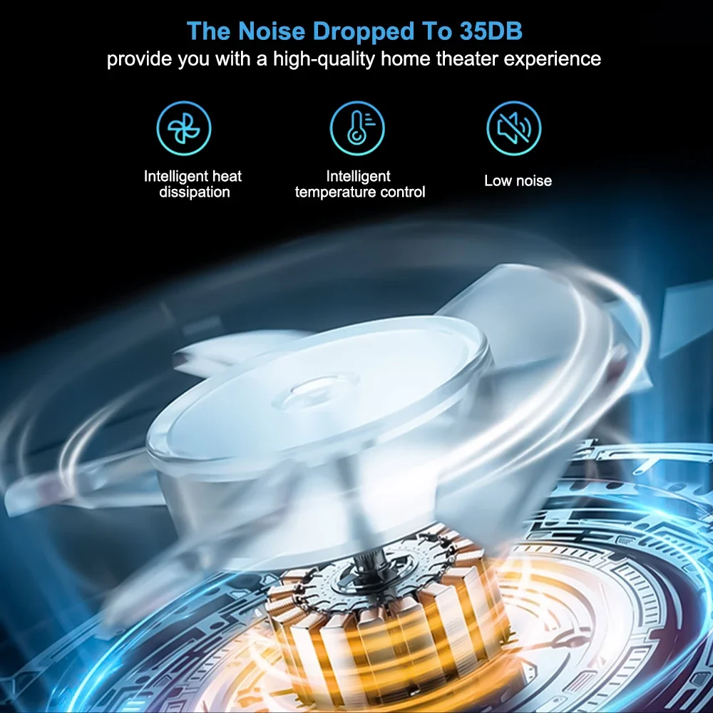 With advanced design, high-density casing, and new airflow system, it ensures excellent heat dissipation and 80% reduced fan noise. Compact yet versatile, it supports HDMI, USB, AV, and 3.5mm interfaces for TV sticks, laptops, and phones. It comes pre-installed with practical software, enhancing compatibility and supporting direct playback of local videos, pictures, music, PPT. It's an ideal choice for offices, outdoors, Christmas.