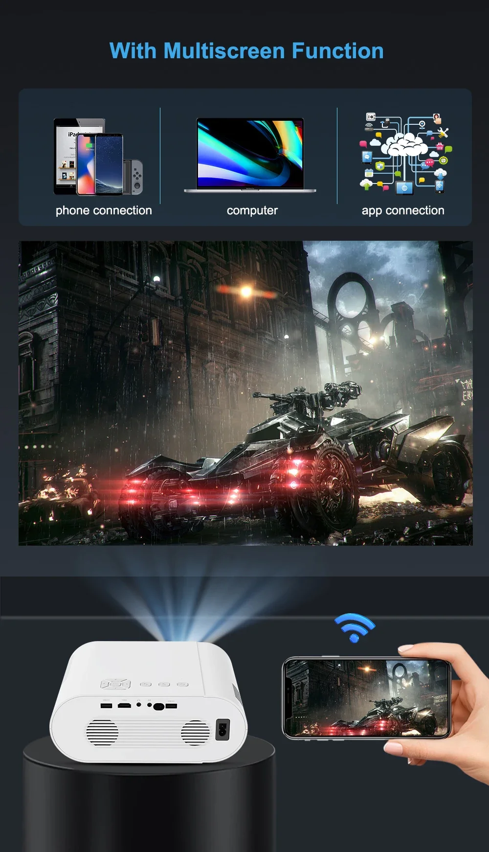 This phone projector built-in dual 5G+2.4G latest wifi 6 connection. Ultra-fast 5G WiFi 6 offers you much smoother and lag free online video experience. This means that projection will be quicker and more reliable.
