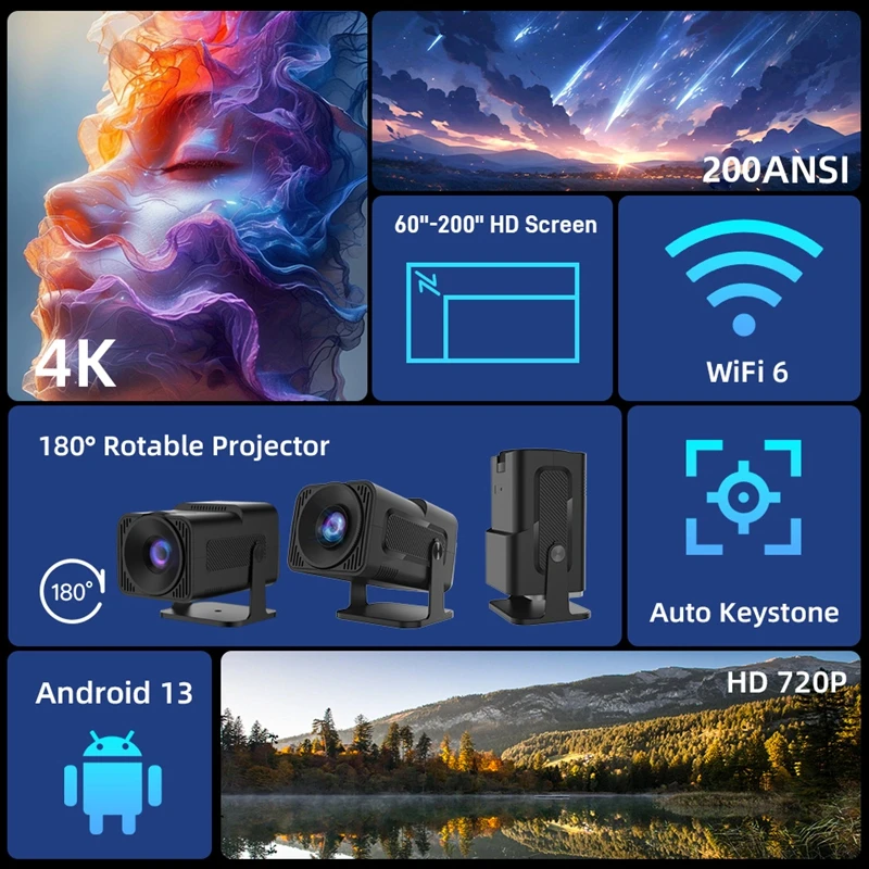 Proyector 4K Android 13 nativo 200ANSI Dual Wifi BT5.0 Proyector portátil de cine actualizado