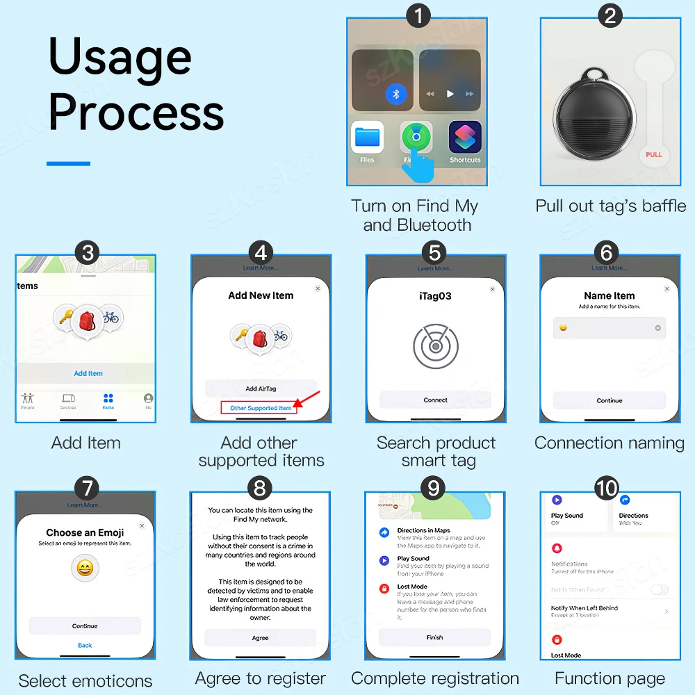 【Easy Pairing】: SZKOSTON Luggage Tracker tag has a very easy pairing method: Open Find My App and Bluetooth, tap “Items” and then “Add Item”, Select “ Other Supported Item” and follow the in-app instruction to complete pairing.(Note: Only compatible with iOS devices, not Android)