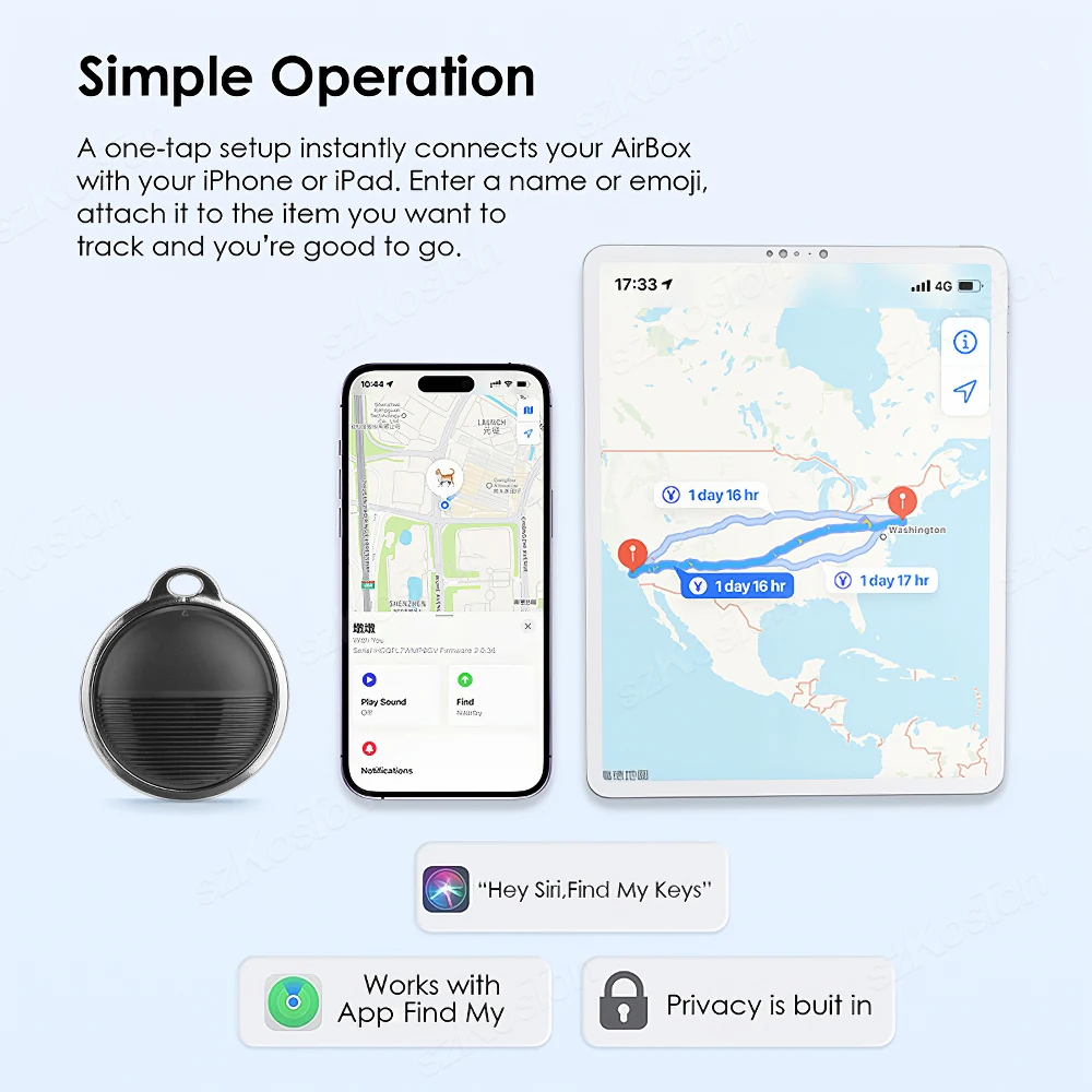【Find Nearby】: Up to 200ft/60m Bluetooth range, ultra-long distance tracking. You can use the Find My app to find your lost items when SZKOSTON Key Finder is in range, or just ask Siri for help. Built-in speaker(loud sound, 80-100 dB) plays beep sound to help you find your things. When your item lost, SZKOSTON key finder can leads you right to yours nearby or tell you the newest location.