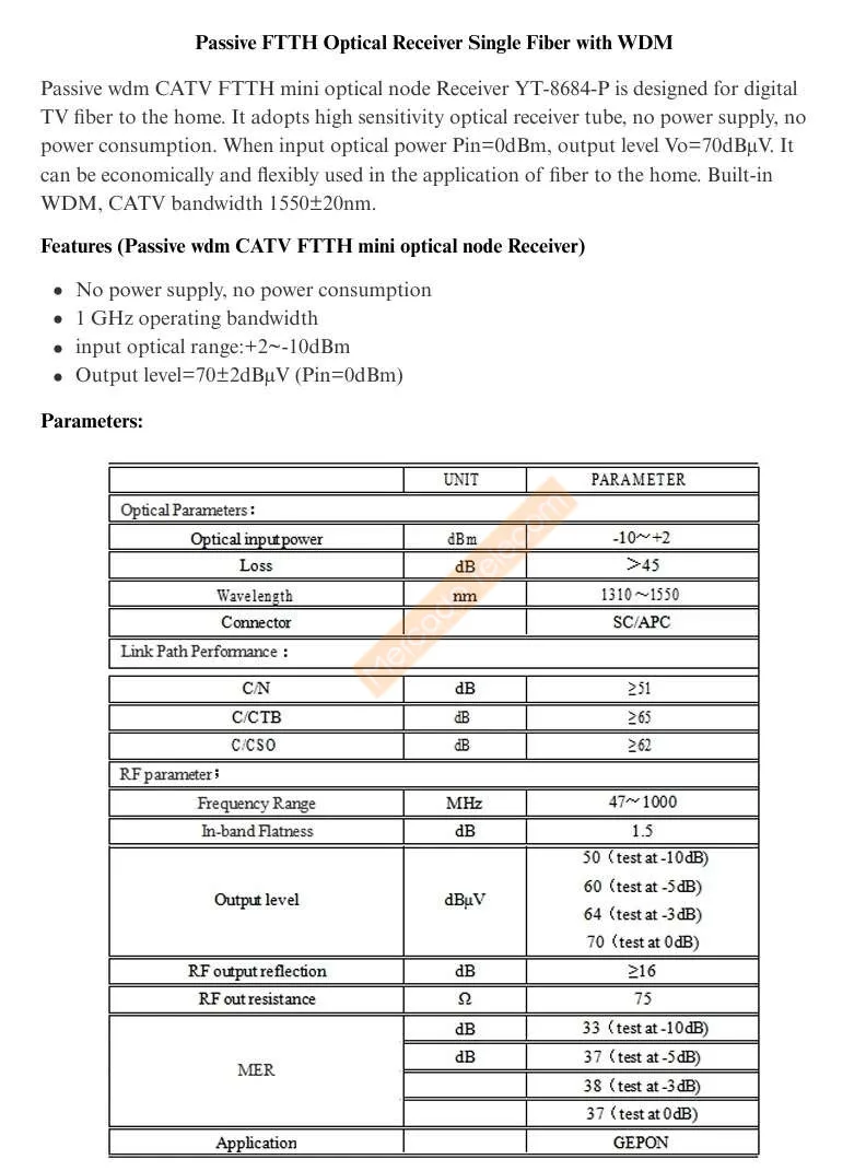 Comprar MINI receptor pasivo CATV fibra óptica FTTH con WDM SC-APC/UPC convertidor de señal óptica a RF YT-8684-P