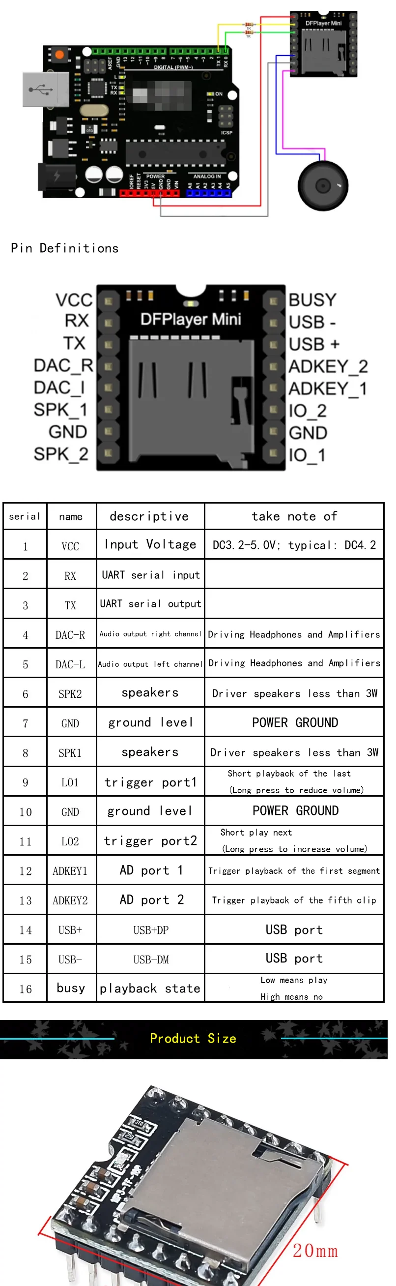 Referencia en línea: https://wiki.dfrobot.com/DFPlayer_Mini_SKU_DFR0299