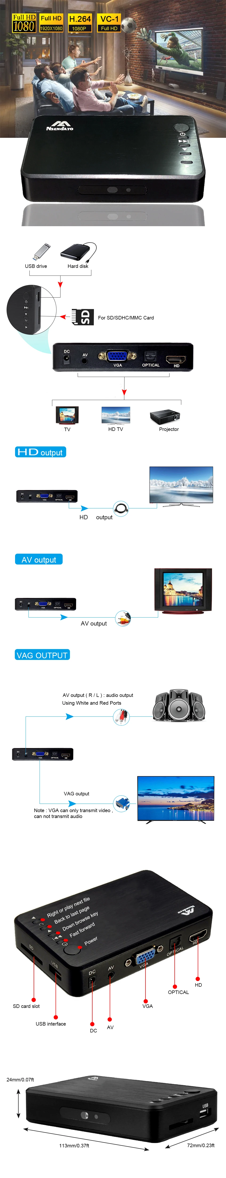 Mini reproductor multimedia Full HD, reproducción automática USB, HDD externo, con cargador de coche, HD, VGA, AV, para SD, U, disco MKV, RMVB