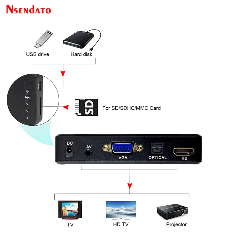 Noted:The model is old media player ,so it can not read if the usb flash driver /SD Card more than 64GB,please noted that Description:You have thousands of video, music, and photo stored in your USB hard drive. Instead of watching it on your computer monitor, now you can simply take your USB hard drive to connect with HDD Multi-Media Player and enjoy your multimedia contents on your HDTV.Specification :Multi-Media HDD Player 1080P Support SD Card, HDD, MS cardMain chipset: F10SD Card Interface: Support SD cardSD Card Interface: Support SD cardUSB Interface: USB 2.0 port, connect another U disk or sd.Surface : Aluminum shell with wired drawingHDD Type FAT32,NTFSVideo Formats RMVB/RM(RV8/9),H.263,H.264(MOV/MP4/M4V),MPEG-1/2(VOB),MPEG- 4(XVID/DIVX),WMV7/VC-1,MKV,AVI,TS/TP,VOB,PMP,FLV.Audio Formats MP3,WMA,AFE,FLAC,OGG,APE,AAC,AC3 and DTSPhoto Formats JPEG,GIF,BMP,PNG.Subtitle Formats SMI, ASS, SSA, SRT, SUB.Video Playback 4:3 or 16:9Language Supports simple Chinese/traditional Chinese, English, Russian, Portuguese, Spanish, Hungarian and Korean.The highest Video output 1080PAudio Output interface Digital, L/R Stereo,OPT.Power Input 100-240V, Output: 5.2V/1.5A.Video Output Interface /AV/VGA.Other Supports photo rotate, zoom and slide show.Accessories1XMedia Player1x Remote Control(Without battery)1x User Manual1xPower Adapter1xAV Cable