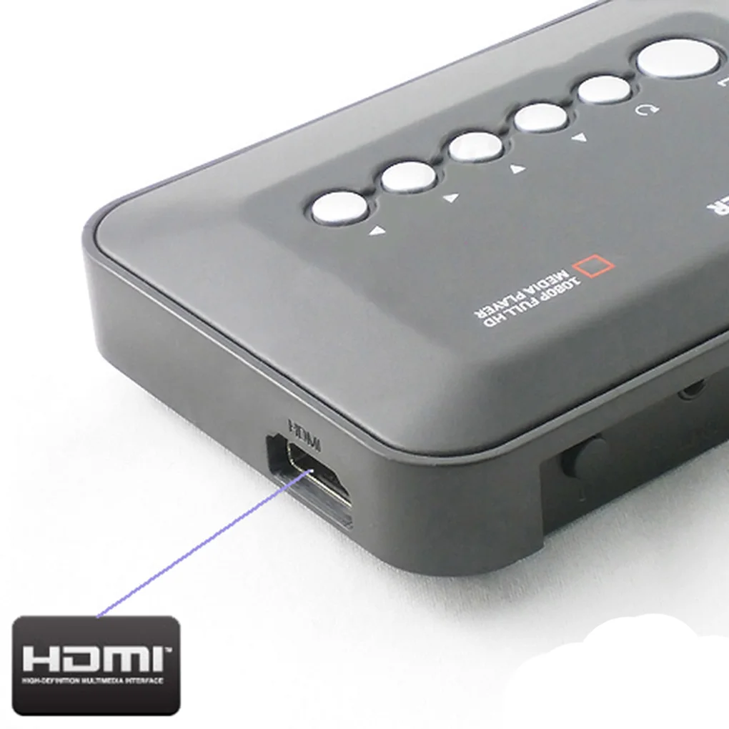 Reproductor multimedia Full HD 1080P. Soporte Plug and play para almacenamiento USB HDD y tarjeta MMC/SD/MS/SDHC.
