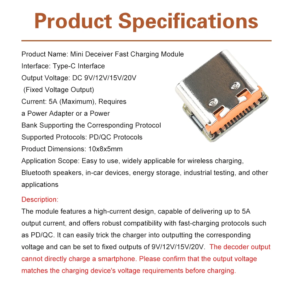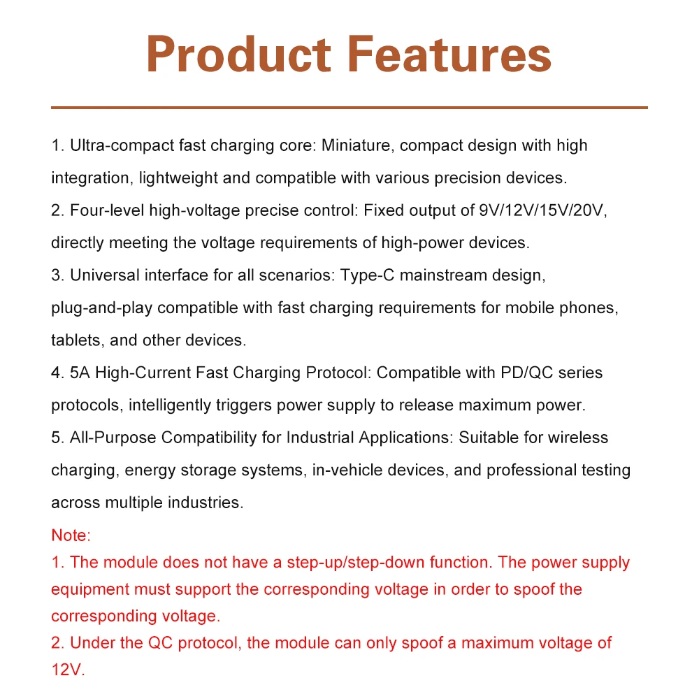El módulo adopta un diseño de alta corriente, con una corriente de salida de hasta 5 A, y tiene una gran compatibilidad para admitir protocolos de carga rápida como PD/QC.Puede atraer fácilmente al cargador para generar el voltaje correspondiente y puede generar voltajes fijos de 9 V/12 V/15 V/20 V respectivamente.La salida del decodificador no puede cargar directamente el teléfono.Confirme si el voltaje de salida coincide con el voltaje de demanda de carga antes de cargar.