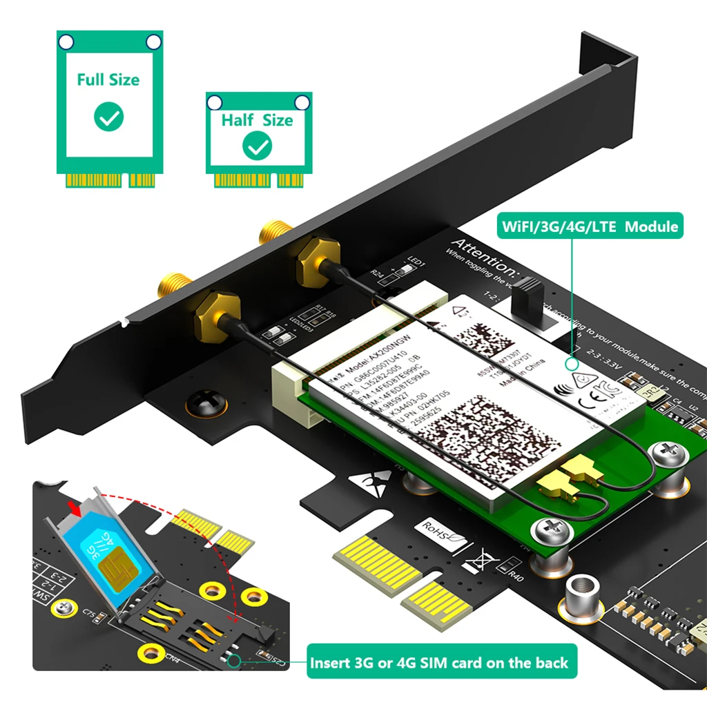 2. Admite Todas Las minitarjetas como 3G,CDMA, WLAN,WWLAN,LTE, WiFi, minitarjeta para PC de escritorio.