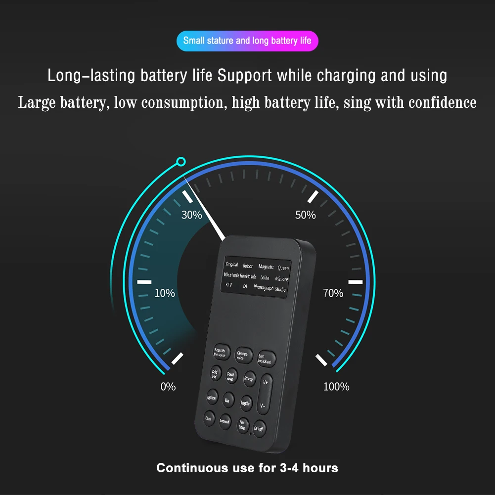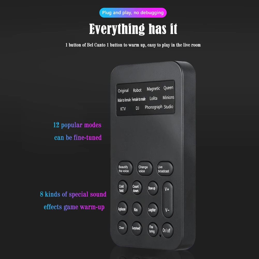 Mini altavoz cambiador de voz en vivo inalámbrico portátil, modulador de tarjeta de cambio de sonido para teléfono, PC, tableta, dispositivo de Audio portátil Característica: Acompañamiento inalámbrico compatible con Bluetooth. Presiona la tecla de encendido para activar la compatibilidad con Bluetooth. La búsqueda del teléfono móvil se puede conectar a la tarjeta de sonido, pruebe el reproductor de música del teléfono móvil, puede elegir libremente música de acompañamiento Una voz clave. 12 modos populares, después de la experiencia de cientos de miles de personas, por el maestro de sintonización afina 12 modos comunes, 1 tecla para usar. El próximo influencer del entretenimiento eres tú. Una tecla cambia el sonido. El interruptor libre de voz masculina/voz femenina/voz de bebé/voz de niña admite ajuste fino, combina más líneas de sonido, sonido más realista Karaoke en vivo. Modo de karaoke profesional preestablecido, cubre defectos de voz, canta más completo y hermoso Un cuerpo pequeño hace un cuerpo grande. Carga de soporte de larga duración mientras se usa, gran potencia, bajo consumo, alta vida, tenga la seguridad de cantar Gran compatibilidad. Compatible con 99.9% aplicaciones. Inteligente compatible con Android/ Apple y otros sistemas, adecuado para las principales transmisiones en vivo, karaoke, plataformas de juegos, etc. Especificación: Modelo: S9 Color: Negro Relación señal-ruido: 106dB Interfaz del teléfono móvil: 3,5mm/0.14in Entrada de carga: 5V/1A Puerto de auriculares: 3,5mm Interfaz de carga USB: MICRO USB Rango dinámico: 106dB Energía de la batería: 3,7 Wh Capacidad de la batería: 230 Mah Duración de la batería: alrededor de 3-4 horas con carga completa Peso: 70g Tamaño: 50*95,7*11,5mm/ 2x3,8x0.45in Introducción: Nacido para cambiar voces por entretenimiento. Tarjeta de sonido Bel Canto de ajuste fino, chip de tarjeta de sonido DSP 1048 incorporado, 12 modos, 8 tipos de sonido de efectos especiales, sonido bel canto de 1 tecla, dispositivo de karaoke en vivo, monitoreo en tiempo real, acompañamiento compatible con Bluetooth, reducción de ruido inteligente, plug and play, ampliamente compatible, compacto y portátil Nota: Debido a los diferentes monitores y efectos de luz, el color real del artículo puede ser ligeramente diferente del color que se muestra en las imágenes. ¡Gracias! Permita una desviación de medición de 1-2cm debido a la medición manual.