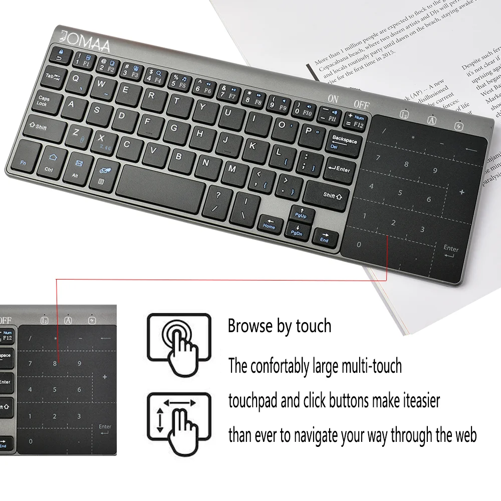 El tacto al presionar el teclado es muy bueno. Se siente similar al tacto de una tecla de un portátil. El panel táctil tiene una función de bloqueo para evitar presiones accidentales mientras se escribe. Sin embargo, cuando se conecta a una PC de Windows, la sensibilidad del panel táctil es un poco baja. No sé por qué, pero cuando se conecta a una tableta Android, la sensibilidad del panel táctil es buena. Puede haber algunos problemas de compatibilidad con mi PC. Sin embargo, aunque la sensibilidad es un poco baja, aún es suficiente para usar, y realmente me gusta este teclado. Es pequeño en tamaño pero se siente ligero y resistente, y me gusta el tacto suave y ligeramente pegajoso de la tecla. Si la sensibilidad del touchpad fuera tan buena como la del trackpad, probablemente habría comprado este teclado aunque fuera más caro. Gracias por el buen teclado.