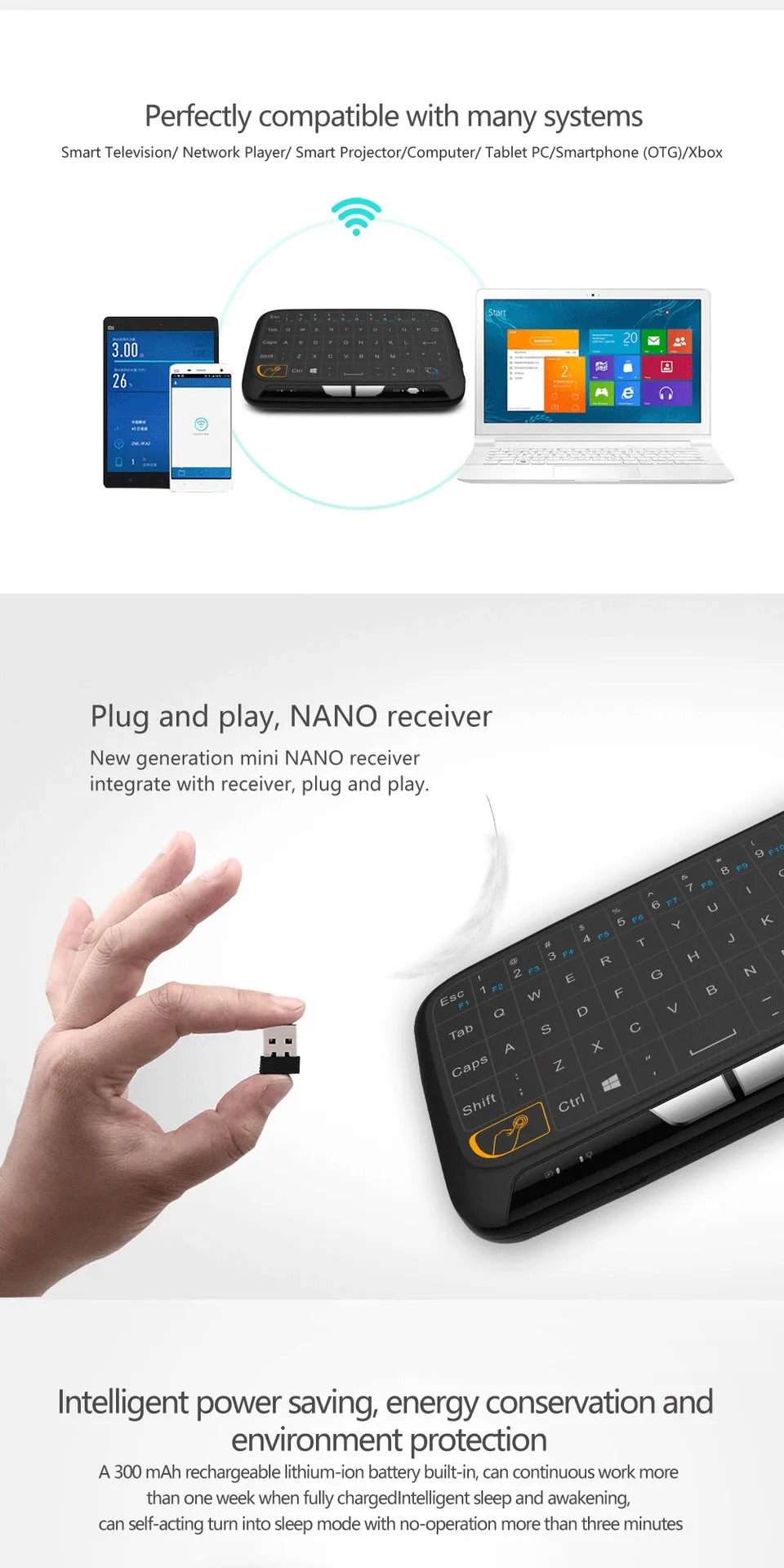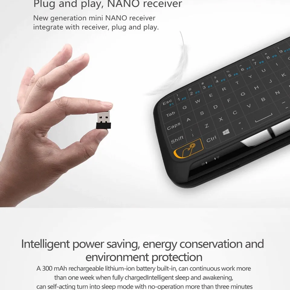 Conexión inalámbrica de 2,4 GHz a través del receptor USB, plug and play, disfrute de control inalámbrico de largo alcance de hasta 10 metros, adecuado para PC, HTPC, smart TV, Android TV Box, computadora portátil, etc.