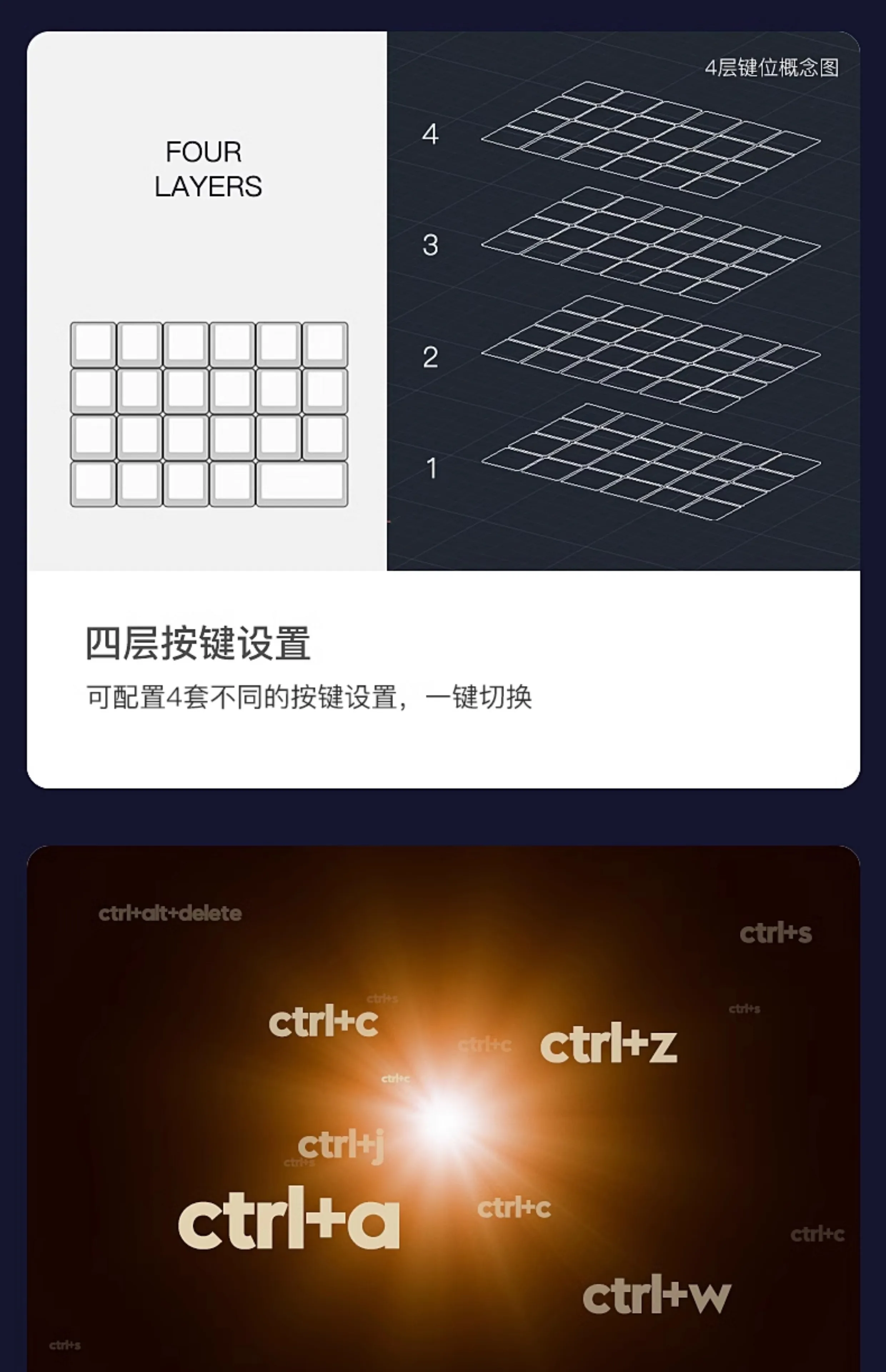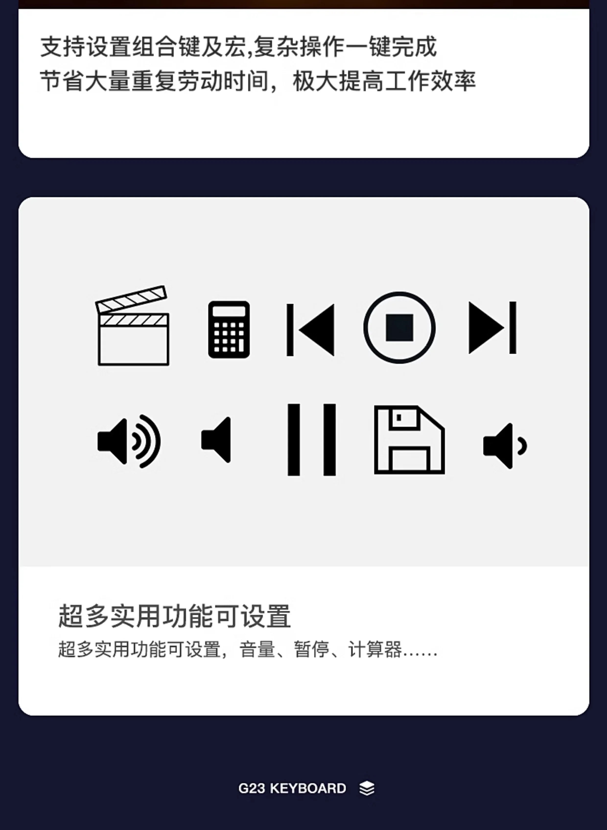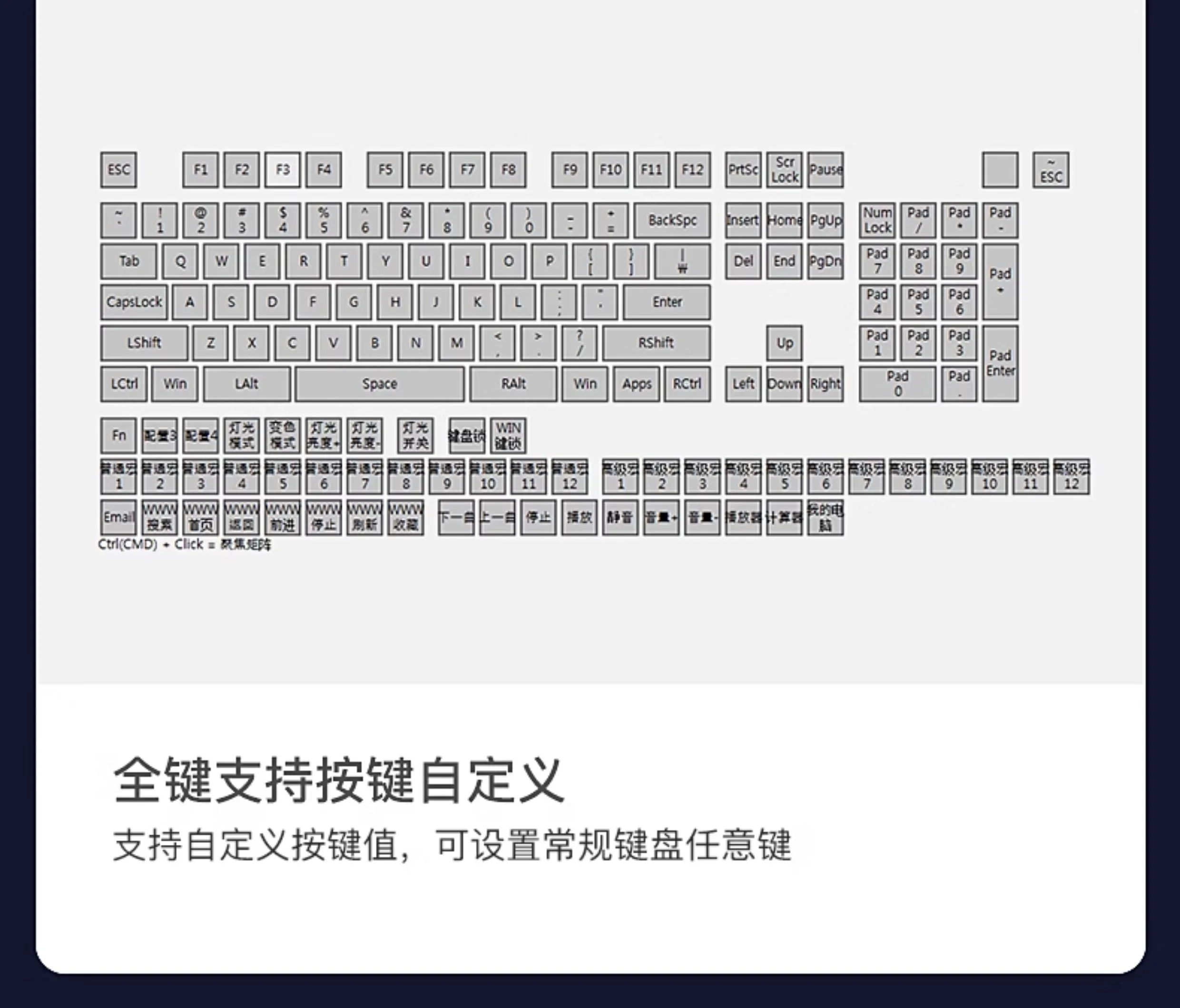 The full key includes knobs that support free setting of regular 104 keys, any key combination, macro, etc