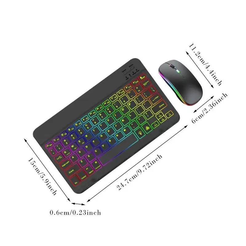 1.Iluminación mejorada: prepárate para trabajar con estilo con nuestro teclado y mouse inalámbricos retroiluminados.Elija entre 7 colores ajustables, entre ellos rojo, naranja, amarillo, verde, cian, azul y morado, con un efecto arcoíris gradual.Cambie entre 2 modos libremente, respirando y luz constante, para una comodidad de escritura ideal.
