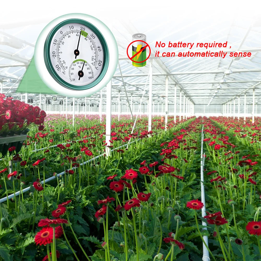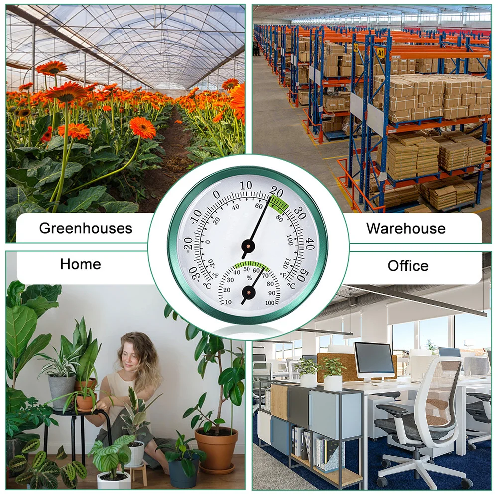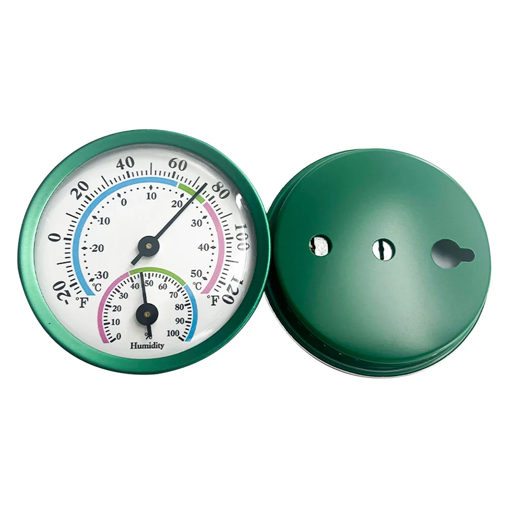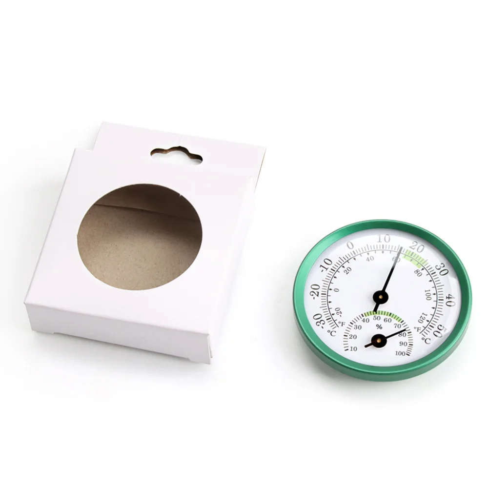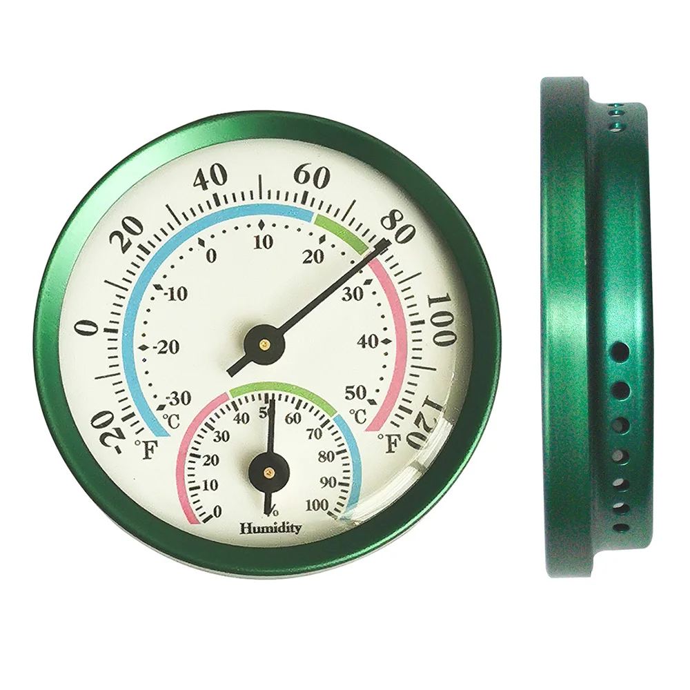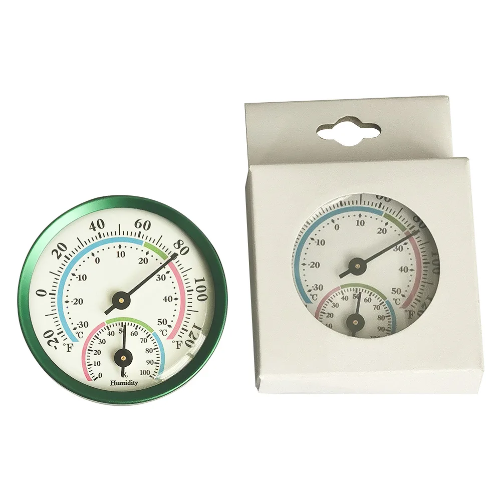 5. Materiales de alta calidad: anillo exterior de aleación de aluminio, superficie de espejo de vidrio, esfera y puntero de aluminio.Estos materiales de alta calidad hacen que nuestro termómetro e higrómetro sean más duraderos.