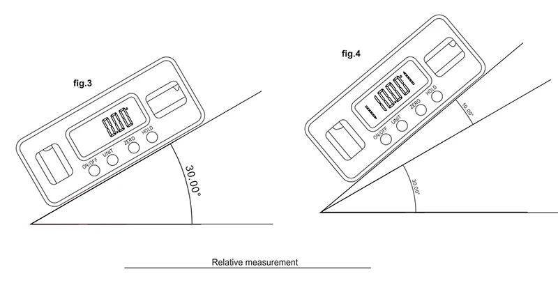 Botones "UNIT" : 4 unidades de medida: grado, % pendiente, mm/m, pulgadas/pies