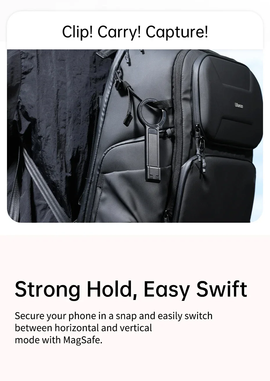 Diseño rápido de clip y agarre:Con un diseño único en forma de mosquetón, este trípode para teléfono permite viajar sin problemas.Simplemente colóquelo en su bolso, liberando sus manos para que pueda estar listo para capturar fotografías impresionantes en cualquier momento y en cualquier lugar.
