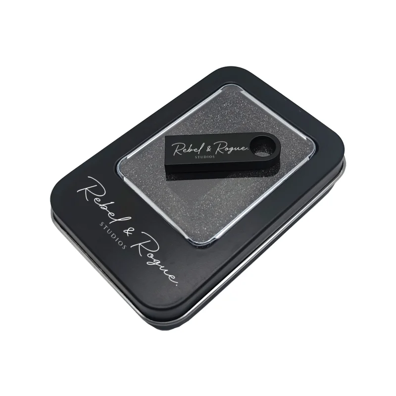 MINI unidad Flash USB 2,0 de Metal negro mate con logotipo de estudio personalizado, 16GB, 32GB, 64GB, 128GB, caja de Metal transparente, 50 unidades por lote