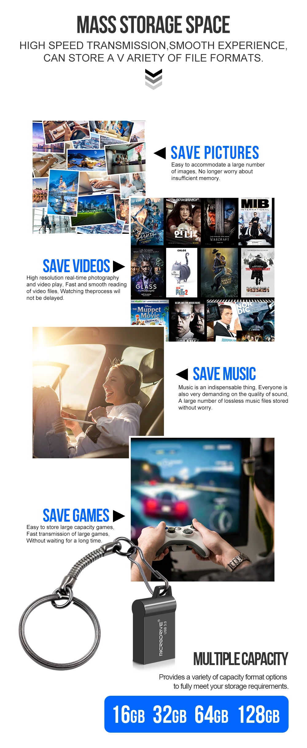 Capacidad: 16 GB/32 GB/64 GB/128 GB