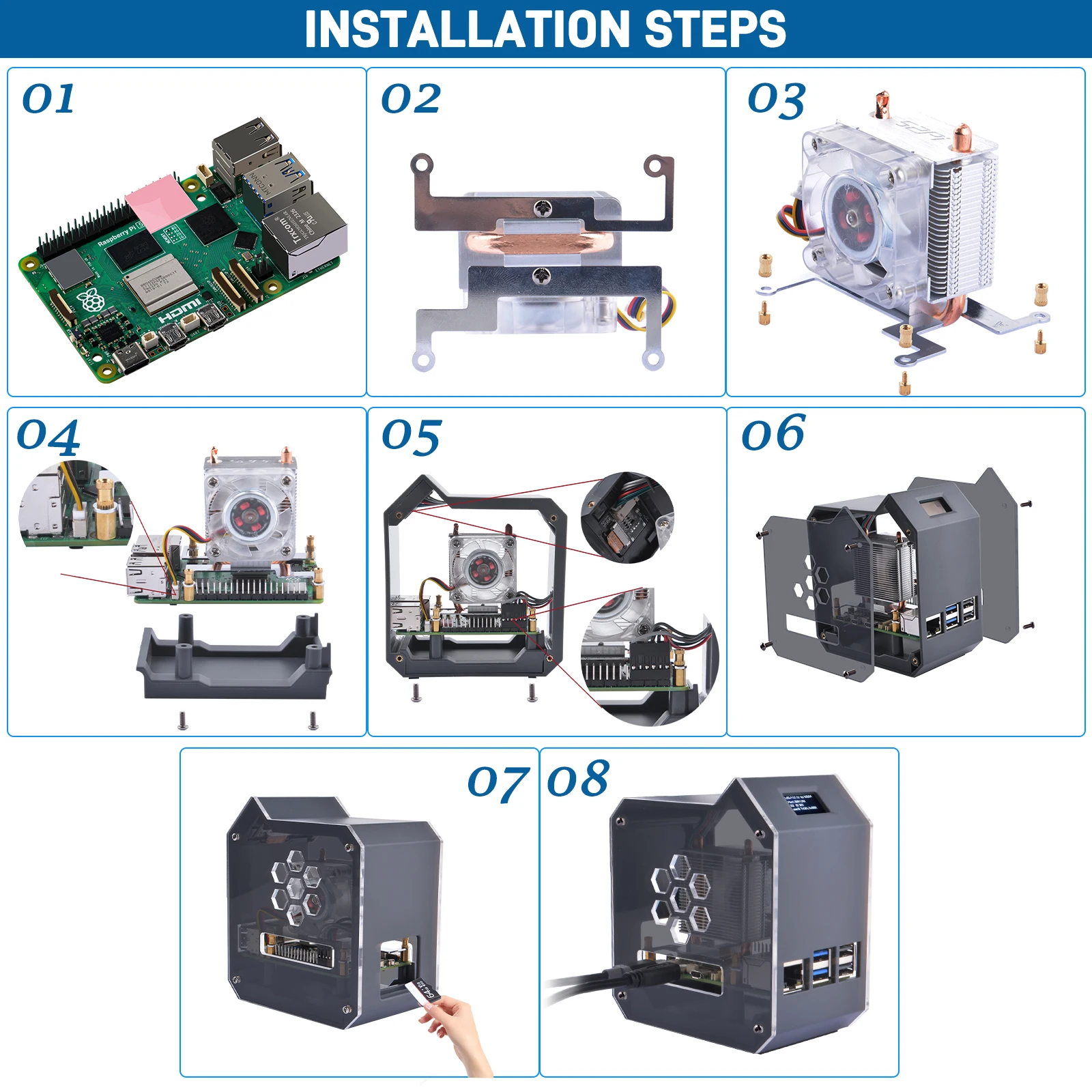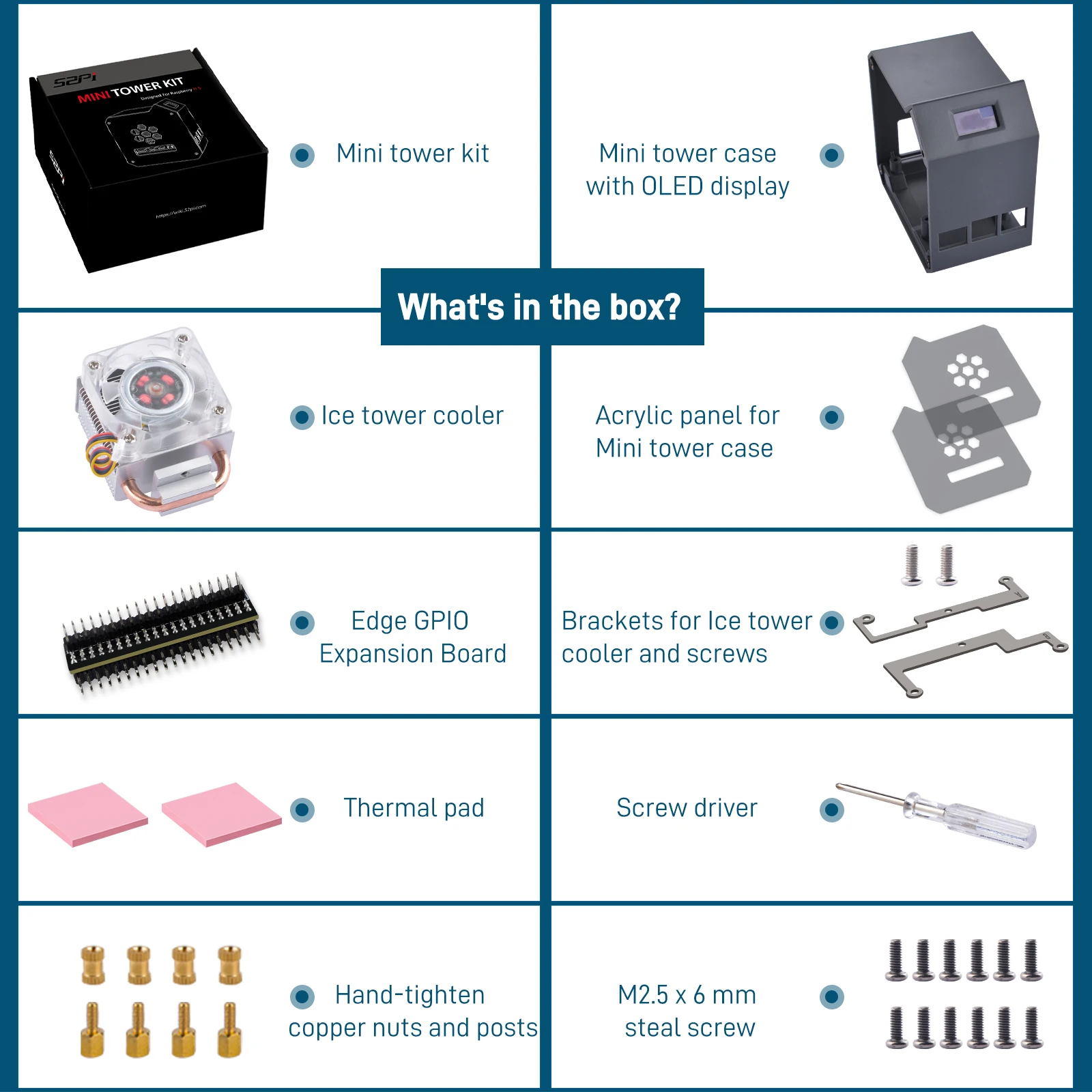 • Enfriador de Torre ICE: equipado con un eficiente enfriador de Torre ICE para reducir eficazmente la temperatura de la Raspberry Pi 5, mejorando el rendimiento y la estabilidad.