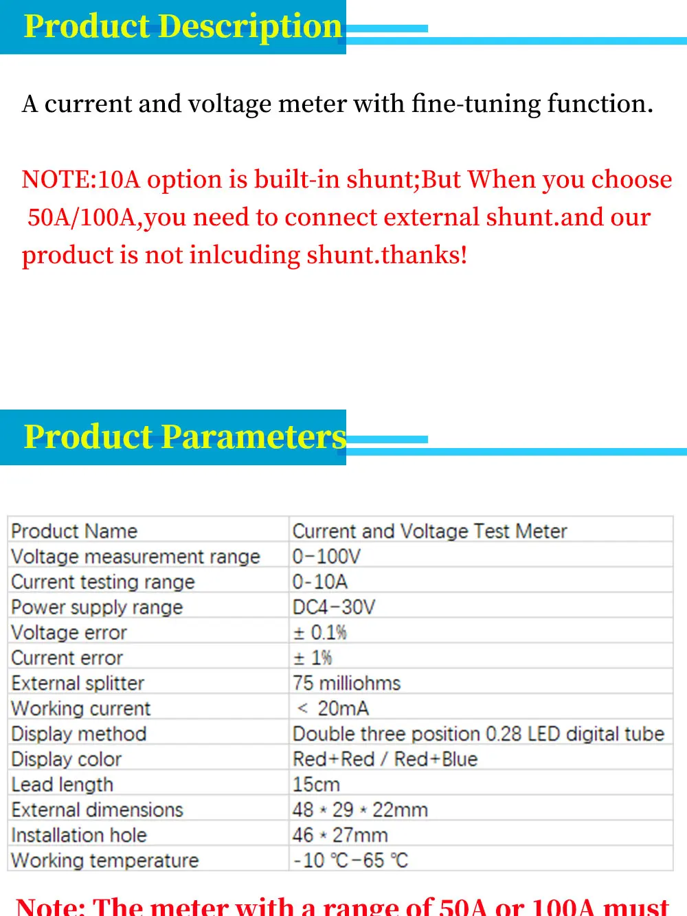 Pedí 2 paquetes de 5 de estos Mini Voltímetros Amperímetros Digitales con la opción de 100 Amps y nos complació que llegaran 3 días antes de la fecha estimada. Lamentablemente, llegaron sin los derivadores de 100A que deberían haber venido incluidos. Me puse en contacto con el servicio de atención al cliente por las piezas faltantes y acordaron un reembolso completo, ya que quería quedarme con los medidores y buscaría los shunts en otro sitio de AliExpress. Al revisar los 10 medidores digitales, solo 7 funcionaron correctamente. Los otros 3 mostraban una lectura de voltaje aproximada, pero la lectura de amperaje era variable y mostraba valores entre 1 y 2 mil veces más altos, siendo totalmente inexactos. Me preocupó mucho la falta de los shunts, pero ocurren errores en los pedidos. Sin embargo, tener 3 de los 10 medidores que no funcionan... Menos mal que contacté al servicio de atención al cliente y aceptaron un reembolso completo.