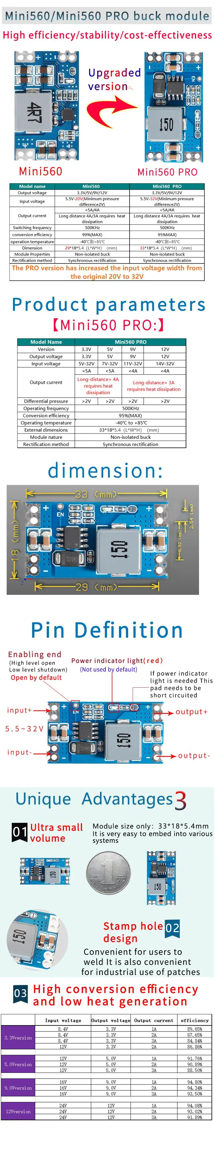 Mini560 / Pro 5A, salida de alta eficiencia de 3,3 V, 5V, 9V, 12V, convertidor reductor de DC-DC, regulador de voltaje Buck estabilizado