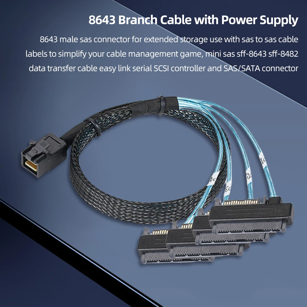 2. Extensión de alimentación:El cable divisor 8643 viene con un puerto de alimentación, que le permite ampliar su uso de almacenamiento. El cable cuenta con una etiqueta de cable SAS a SAS que simplifica la gestión de cables.
