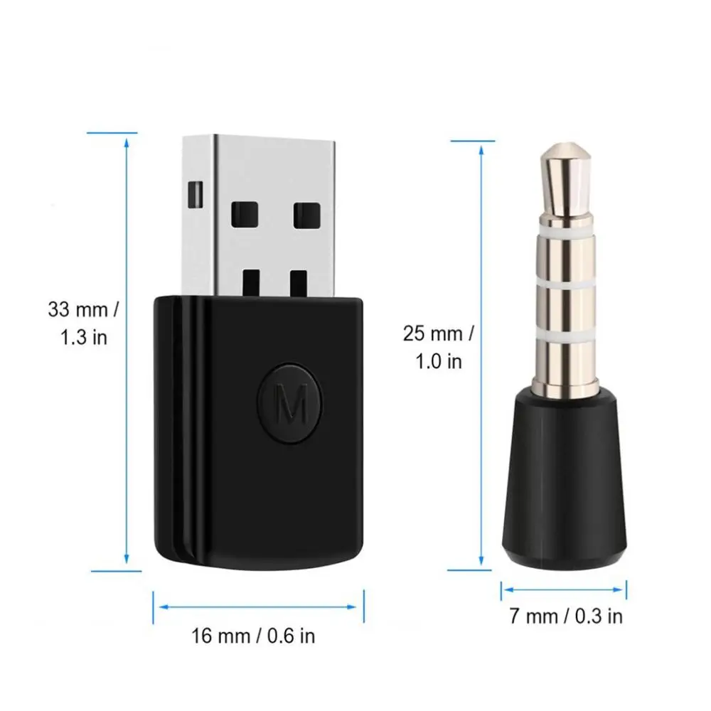 El Dongle Bluetooth se actualizó a la última versión con un rendimiento estable. Dimensiones: aproximadamente 3,3 cm x 1,6 cm x 0,8 cm rango de transmisión: 33 pies (10 metros) Perfecto Compatible: se adapta a cualquier auricular Bluetooth Un adaptador USB que se conectará a cualquier dispositivo de audio Bluetooth cuando se conecte a la ranura USB. Viene con un micrófono inalámbrico que te permitirá chatear cuando te conectes al controlador. Un cable macho de 3,5mm A hembra, conexión perfecta al micrófono. Un clip de cable, el micrófono fijado en tu ropa. Esto te permite jugar sin ruido mientras habla con el micrófono, para ofrecerte la experiencia de juego perfecta.