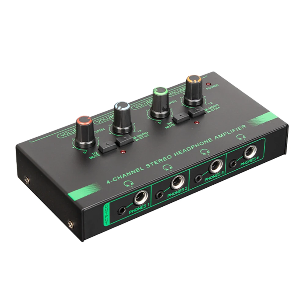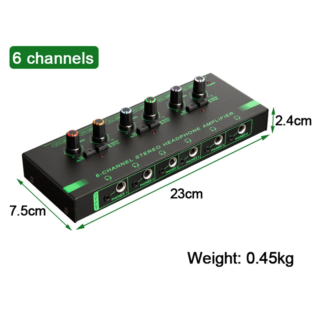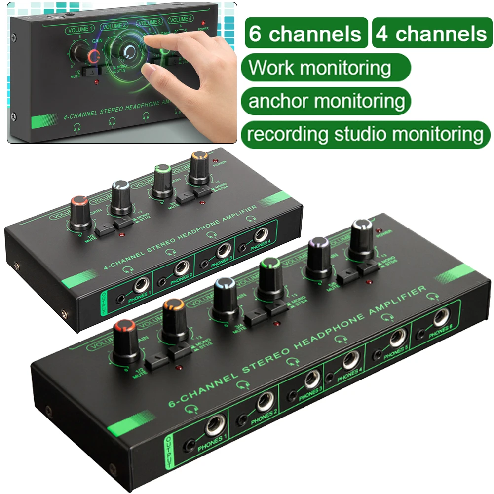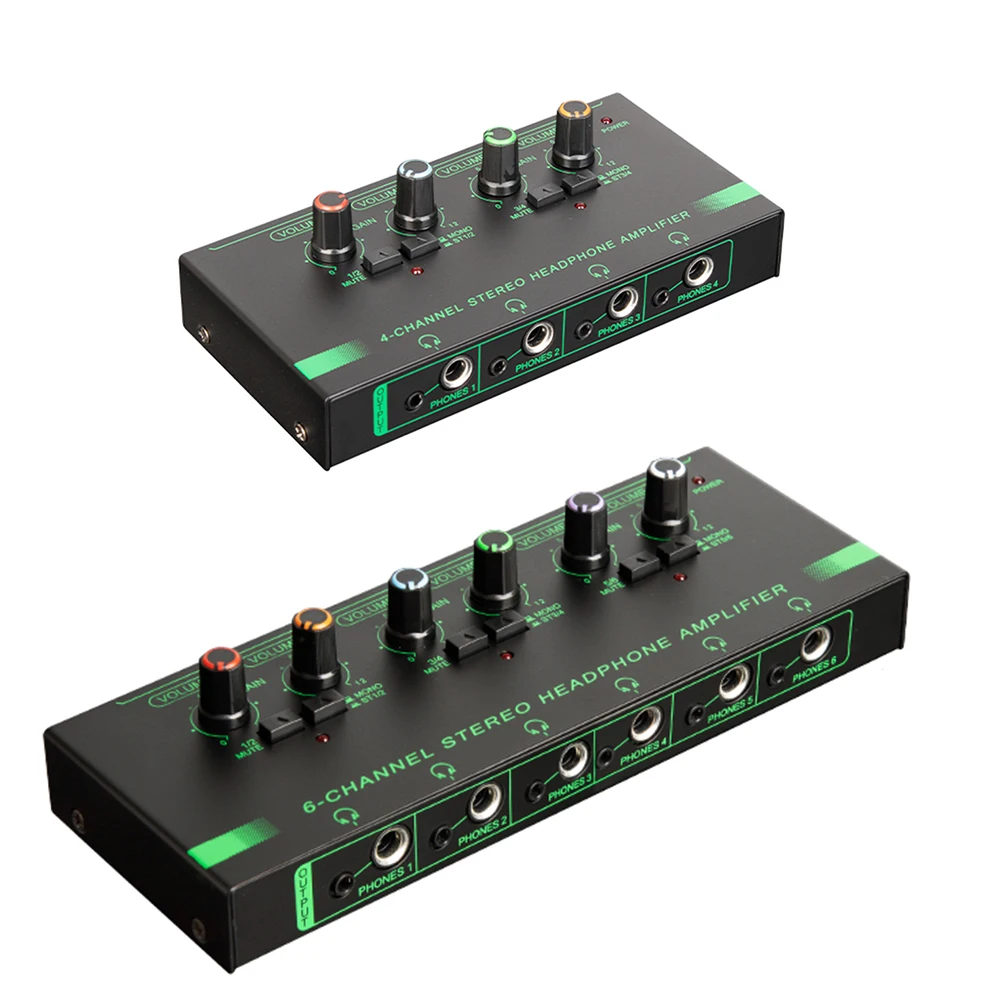 Mini Audio estéreo de 4/6 canales, amplificador de auriculares, Control de volumen, amplificador de Audio estéreo de Metal, sistema de monitoreo en la oreja, Mini divisor de auriculares portátil, entrada de 6,35/3,5mm para escenario y estudios