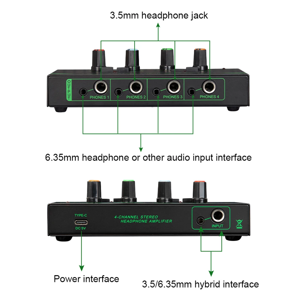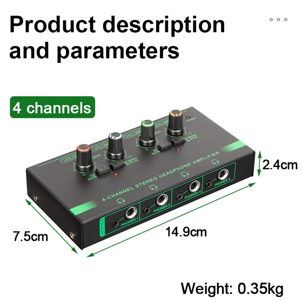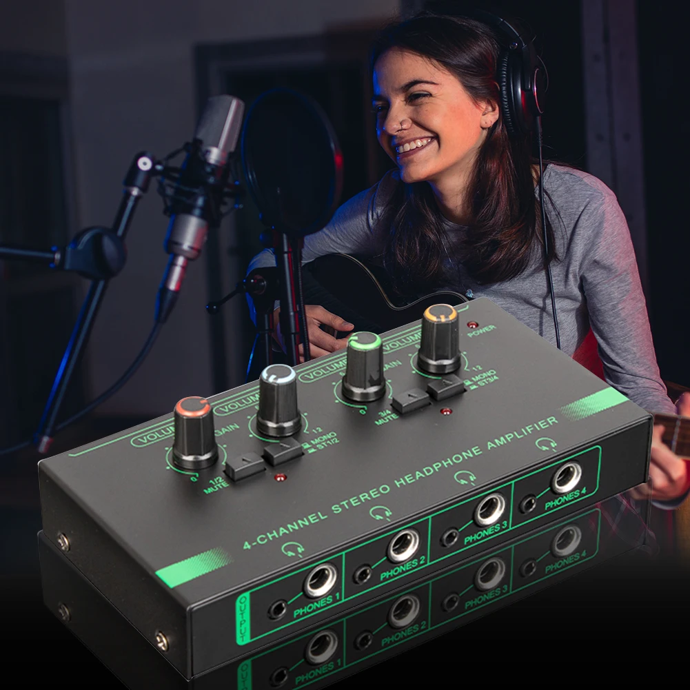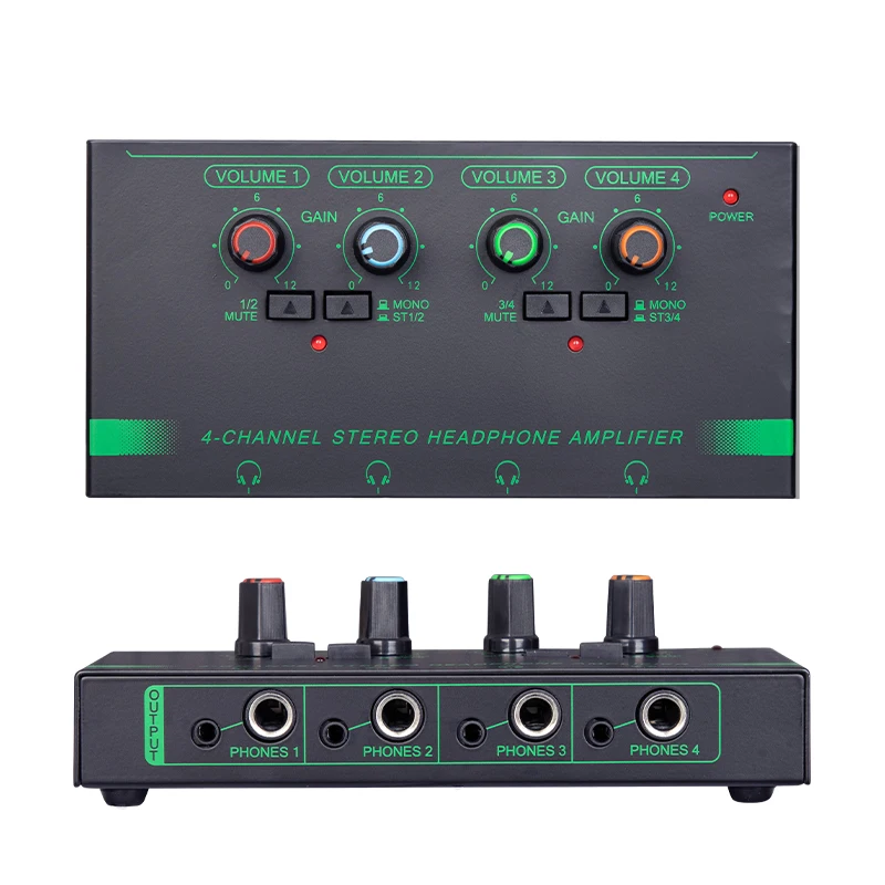 3. Amplificador de auriculares estéreo de 4/6 canales:Con salida de ruido ultra bajo, Este amplificador de auriculares estéreo cuenta con 4/6 canales, cada uno con control de nivel de salida individual. Es compatible con auriculares de 3,5mm y 6,35mm (sin necesidad de adaptadores convertidores).
