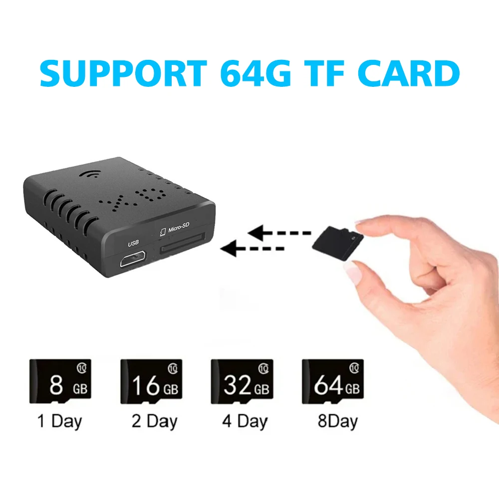 7. Soporte máximo de tarjeta de memoria de 64G, visión nocturna automática y detección de movimiento y grabación en bucle, Conéctese a la fuente de alimentación para la grabación de vigilancia.