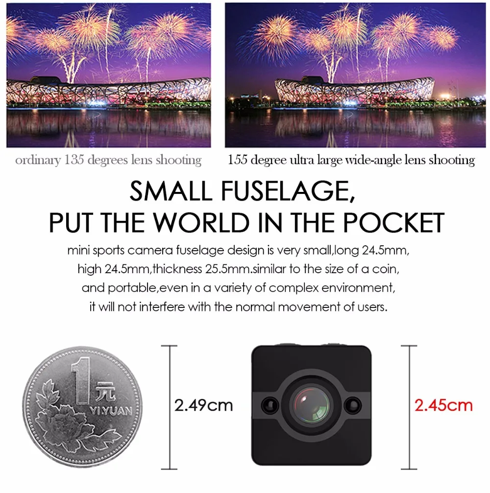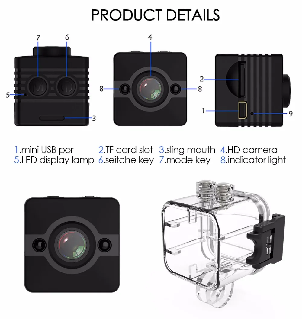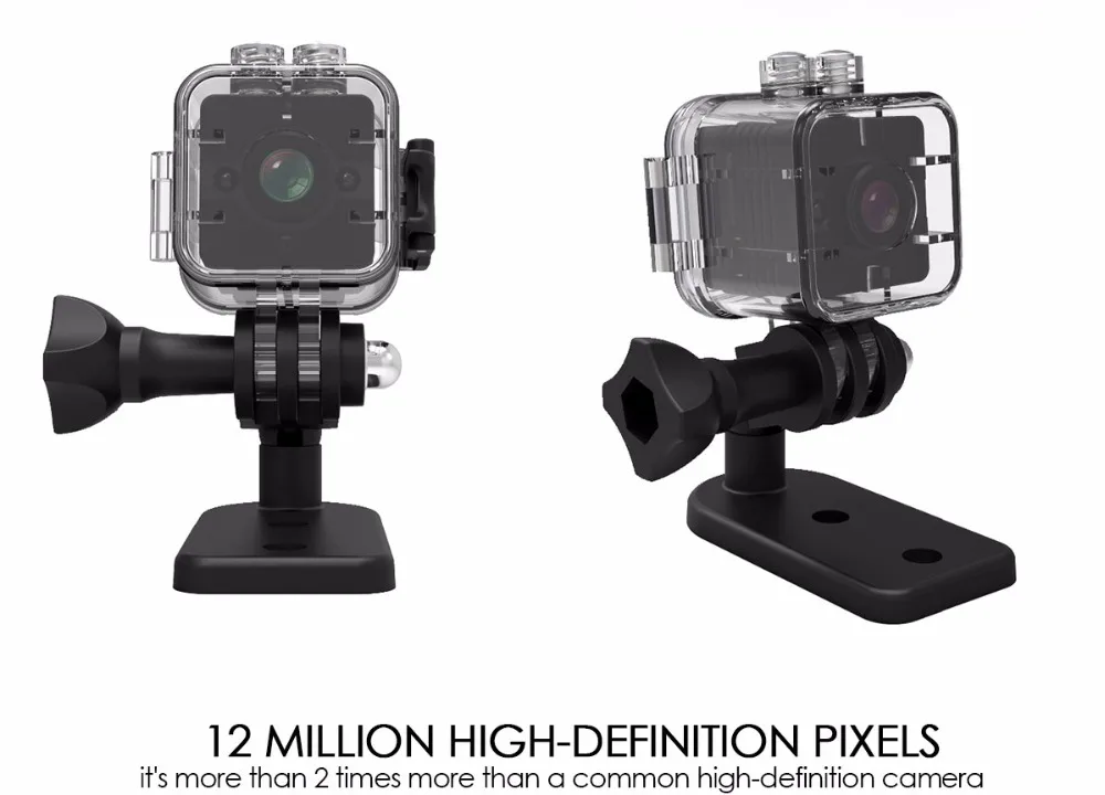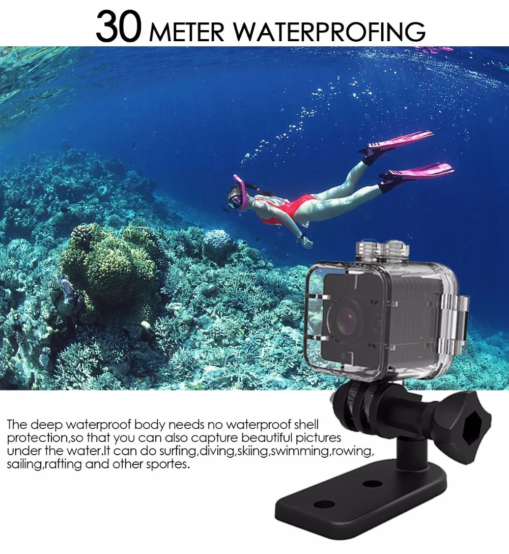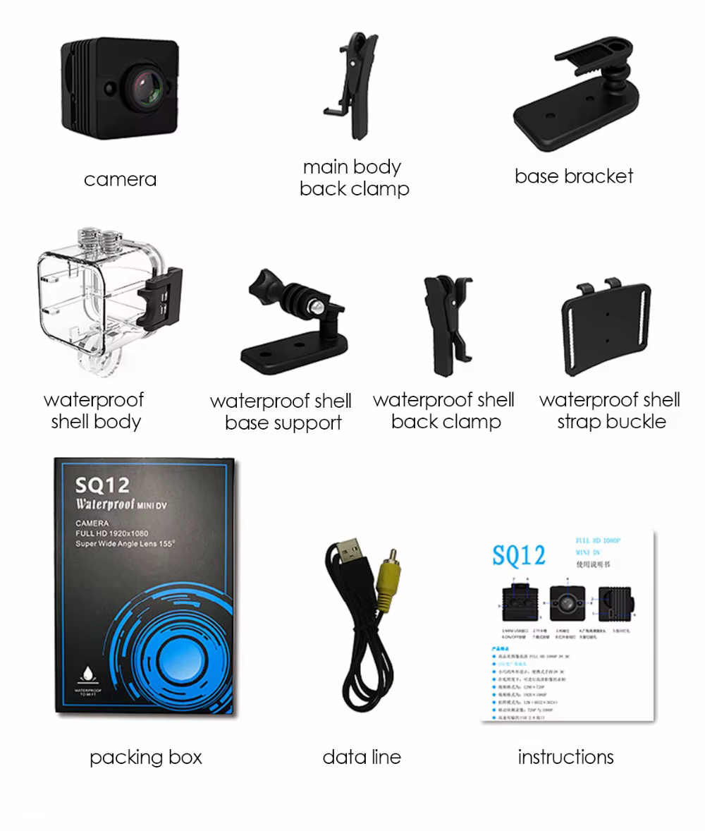 La mini cámara SQ12 de es una mini grabadora de cámara DVR Full HD de 1080P. Con su capacidad máxima de 30 metros de impermeabilidad, también puede hacer videos perfectos bajo el agua. Deja pasar su potente versión nocturna que te permite obtener vídeos nítidos incluso por la noche. Además, El SQ12 admite una tarjeta TF de hasta 32G (no incluida), por lo que no tiene que preocuparse por los problemas de almacenamiento.EspecificacionesTamaño: 245*245*255mmFormato de vídeo: AVICodificación de vídeo: M-IPEGResolución de vídeo: 1920*1080P 1280*720PVelocidad de fotogramas de vídeo: 30fpsRelación de imagen: 16:9Formato de imagen: JPGDetección de movimiento: SíSALIDA TV: SíCapacidad de la batería: 200mAh de litio incorporadoHoras de trabajo: hasta 80 minutosSoporte: Tarjeta TF de hasta 32G (no incluida)Velocidad de transmisión: USB2.0 de alta velocidadTipo de interfaz: Mini USB de 8 pinesCaracterísticasMini grabadora de cámara DVR Full HD de 1080P; Alta definición full HD1080P; Diseño compacto High-qCámara de gran angular de cristal de 155 grados para proporcionar imágenes de alta calidad y vídeos dinámicos fluidosCapacidad máxima de impermeabilidad de 30 metros para vídeos submarinos increíblesFunción de visión nocturna de hasta 8 metrosBatería de litio incorporada de 200MAH para hasta 80 minutos de grabaciónEmbalaje lista1 x SQ121 x abrazadera1 x soporte base1 cuerpo de carcasa impermeable1 soporte de base de carcasa impermeable1 abrazadera trasera impermeable1 x hebilla de correa de carcasa impermeablePedir puntasCargue el SQ12 primero antes de usarlo por primera vez y si no va a usar el dispositivo durante mucho tiempo, cárguelo ocasionalmente, gracias.