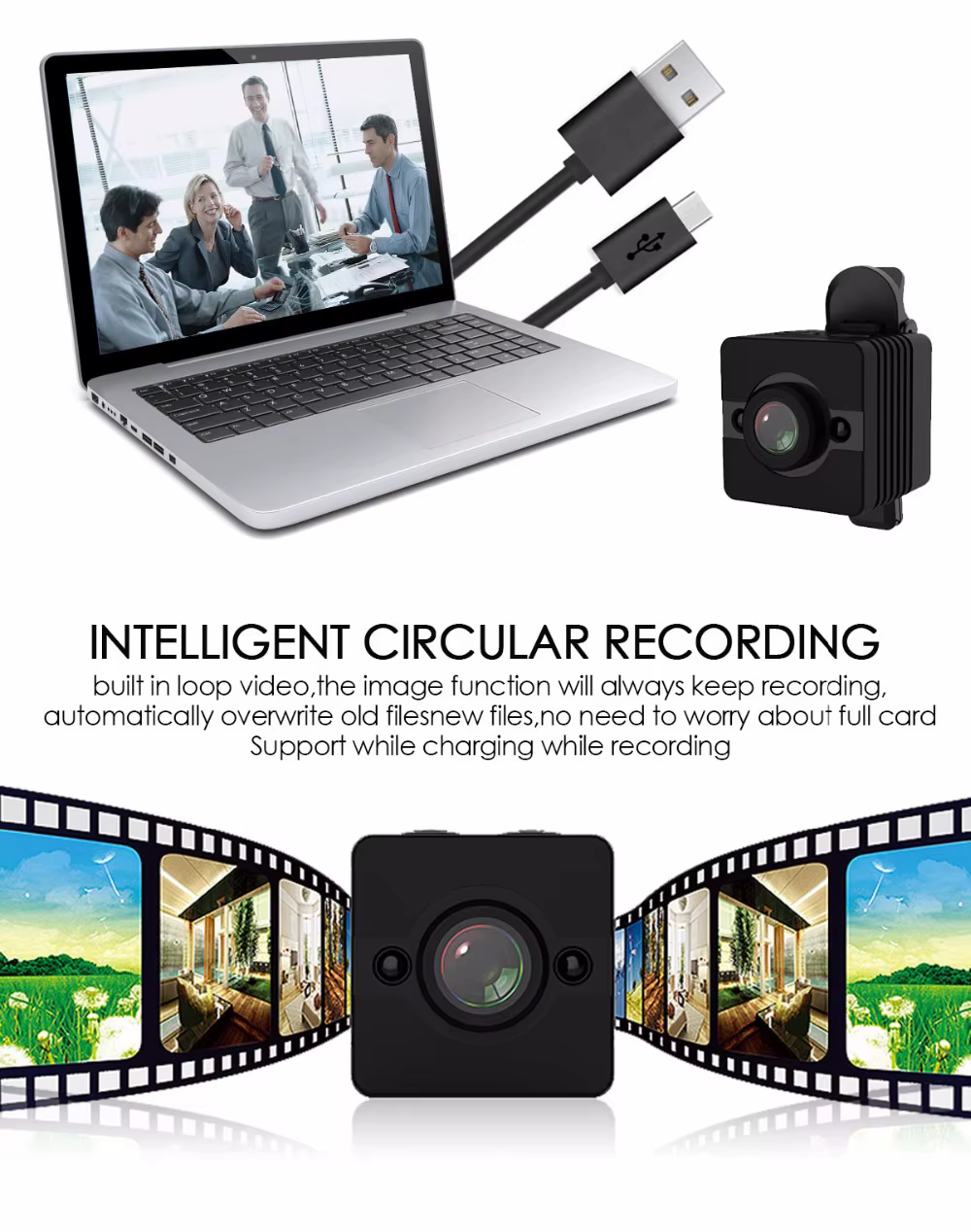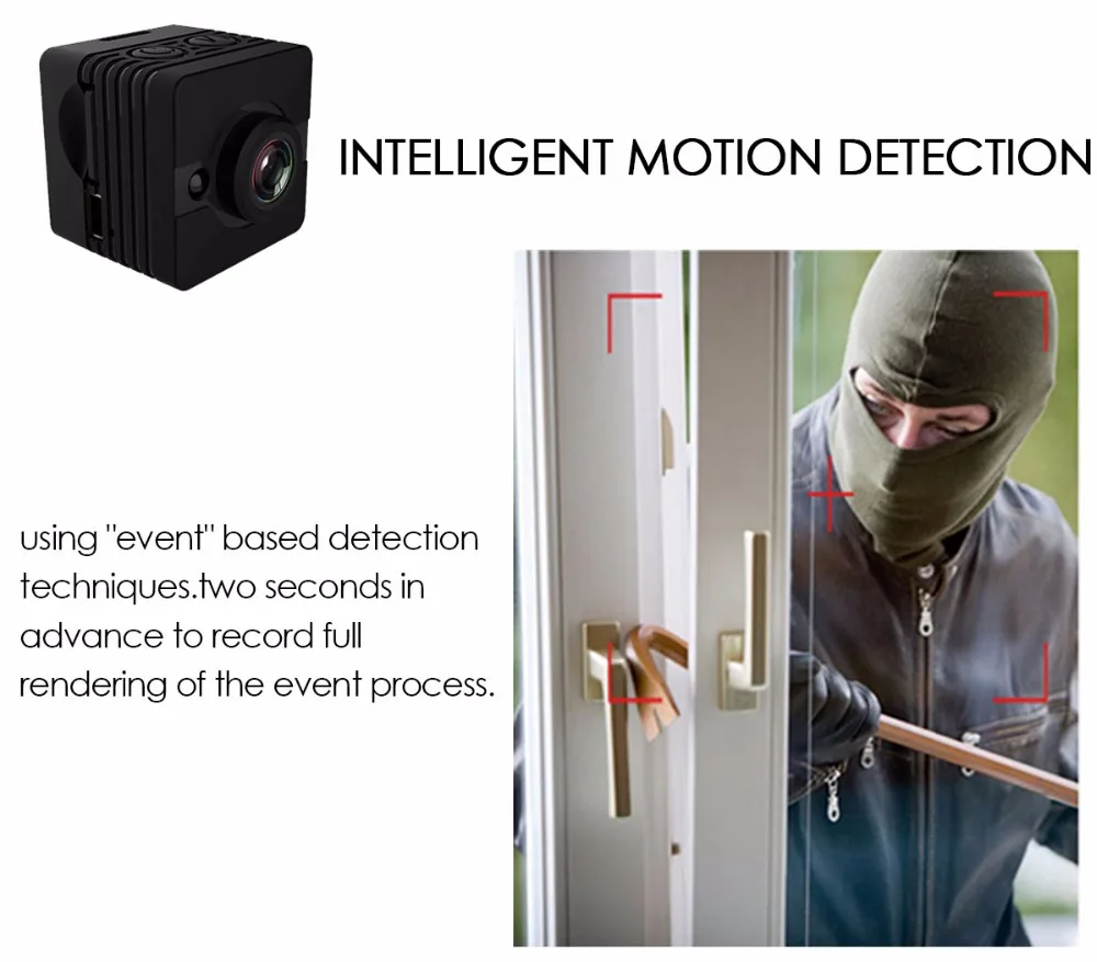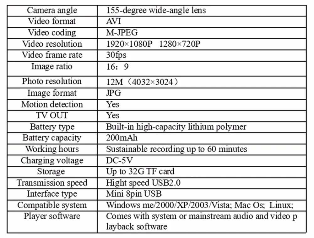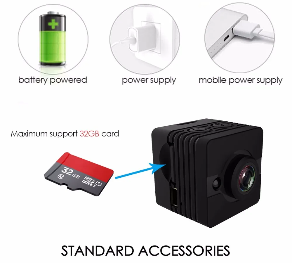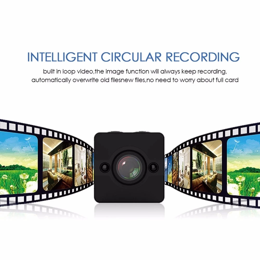 La mini cámara SQ12 de es una mini grabadora de cámara DVR Full HD de 1080P. Con su capacidad máxima de 30 metros de impermeabilidad, también puede hacer videos perfectos bajo el agua. Deja pasar su potente versión nocturna que te permite obtener vídeos nítidos incluso por la noche. Además, El SQ12 admite una tarjeta TF de hasta 32G (no incluida), por lo que no tiene que preocuparse por los problemas de almacenamiento.EspecificacionesTamaño: 245*245*255mmFormato de vídeo: AVICodificación de vídeo: M-IPEGResolución de vídeo: 1920*1080P 1280*720PVelocidad de fotogramas de vídeo: 30fpsRelación de imagen: 16:9Formato de imagen: JPGDetección de movimiento: SíSALIDA TV: SíCapacidad de la batería: 200mAh de litio incorporadoHoras de trabajo: hasta 80 minutosSoporte: Tarjeta TF de hasta 32G (no incluida)Velocidad de transmisión: USB2.0 de alta velocidadTipo de interfaz: Mini USB de 8 pinesCaracterísticasMini grabadora de cámara DVR Full HD de 1080P; Alta definición full HD1080P; Diseño compacto High-qCámara de gran angular de cristal de 155 grados para proporcionar imágenes de alta calidad y vídeos dinámicos fluidosCapacidad máxima de impermeabilidad de 30 metros para vídeos submarinos increíblesFunción de visión nocturna de hasta 8 metrosBatería de litio incorporada de 200MAH para hasta 80 minutos de grabaciónEmbalaje lista1 x SQ121 x abrazadera1 x soporte base1 cuerpo de carcasa impermeable1 soporte de base de carcasa impermeable1 abrazadera trasera impermeable1 x hebilla de correa de carcasa impermeablePedir puntasCargue el SQ12 primero antes de usarlo por primera vez y si no va a usar el dispositivo durante mucho tiempo, cárguelo ocasionalmente, gracias.