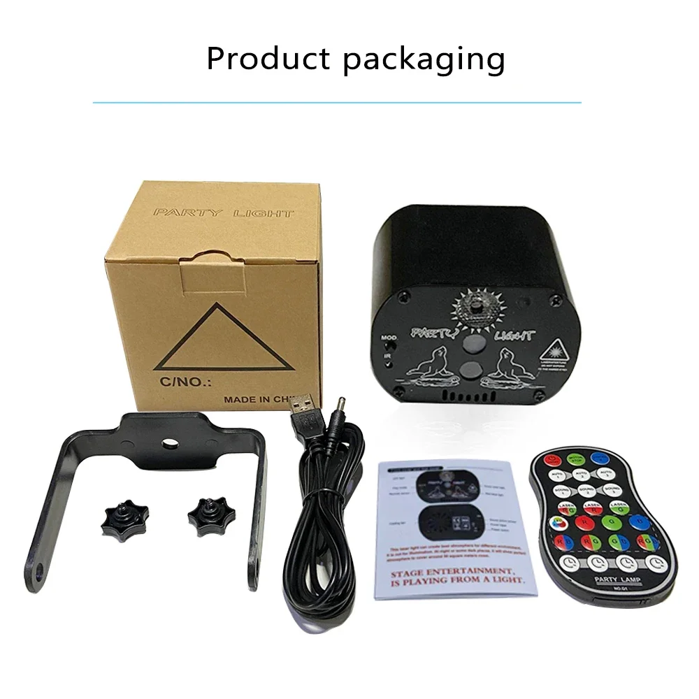 1 * Control remoto (con batería)1 * Cable USB1 * accesorios (paquete)1 * Manual de usuarioNota:1. Tenga cuidado de no mirar directamente a la apertura del láser para evitar lesiones en los ojos.2. Esta unidad es solo para uso en interiores y debe protegerse del agua, la humedad y las sacudidas.