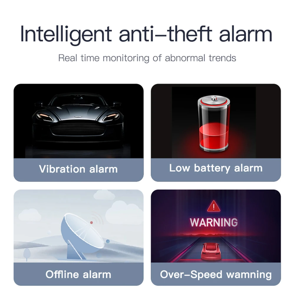 3. Alertas antirrobo inteligentes:El localizador en tiempo real cuenta con múltiples alarmas inteligentes, incluidas alertas de vibración, batería baja, fuera de línea y de exceso de velocidad, complementadas con notificaciones de alerta. Este sistema le permite mantenerse informado de cualquier actividad inusual, garantizando la seguridad de sus pertenencias o de sus seres queridos.