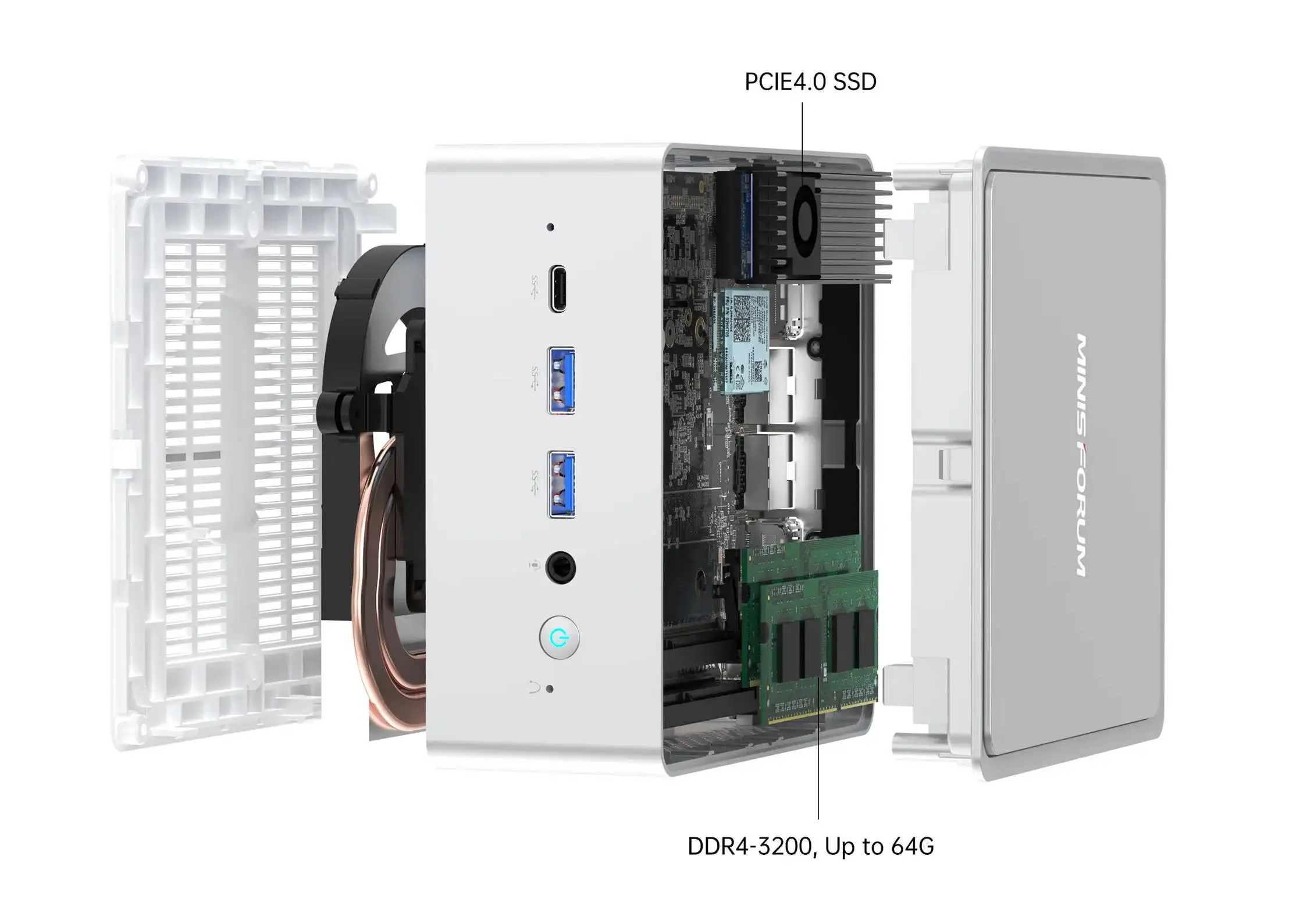 NAB6 Lite Mini PC is equipped with 16GB dual-channel DDR4 memory (each replaceable with 32GB), M.2 2280 512GB PCIe4.0 SSD (up to 2TB). The pop-up design allows you to easily update your configuration.Besides, it can add a 2.5" HDD/SSD (no included) to expand storage up tp 2TB to suit your needs.