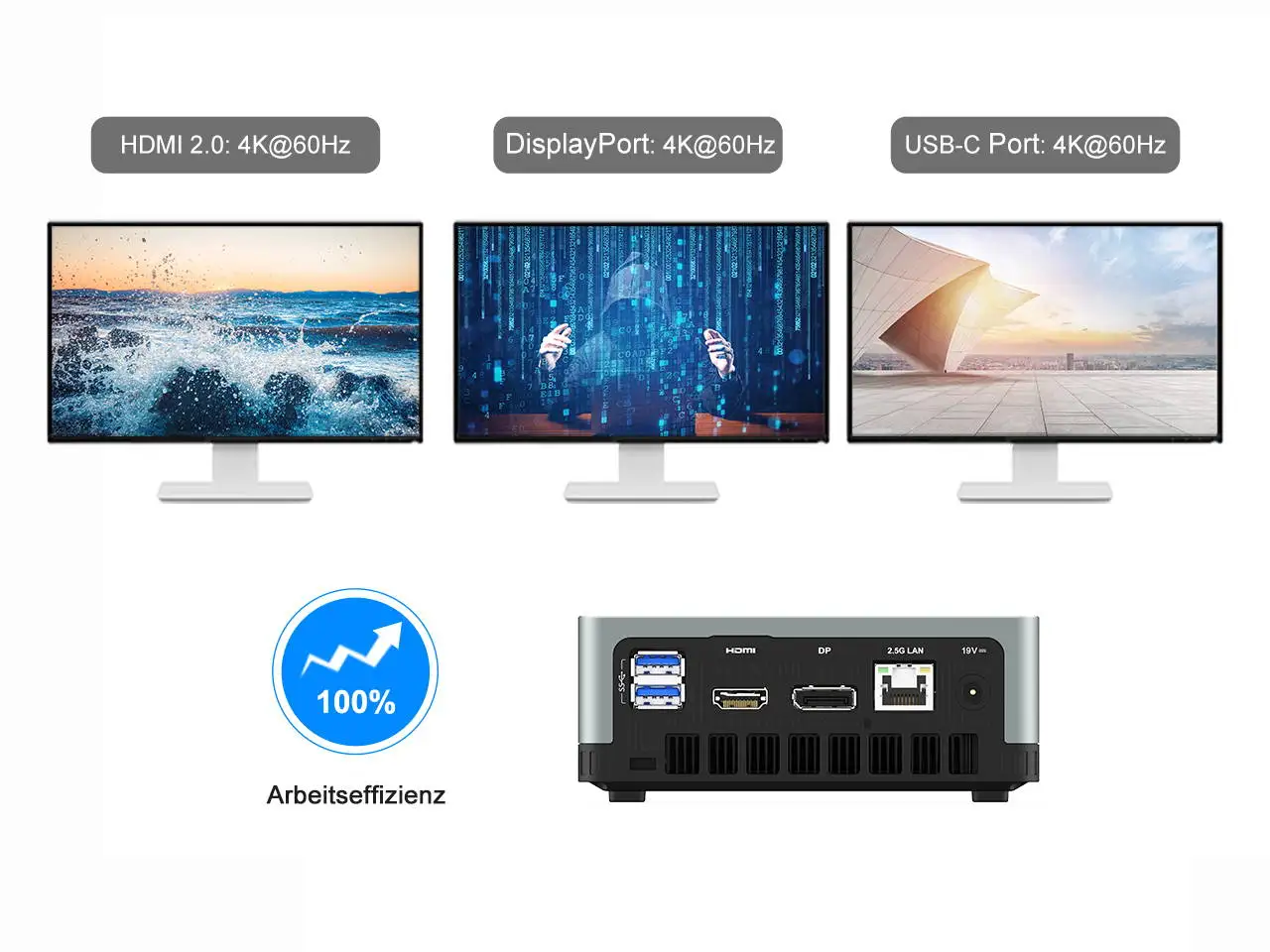 Usando HDMI, DisplayPort y Puerto USB C, DeskMini UM350 puede manejar hasta tres pantallas independientes con una claridad increíble para aumentar su productividad en su flujo de trabajo.